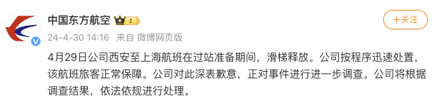 據(jù)中國東方航空微博消息,4月29日公司西安至上海航班在過站準(zhǔn)備期間,滑梯釋放。公司按程序迅速處置,該航班旅客正常保障。公司對此深表歉意,正對事件進(jìn)行進(jìn)一步調(diào)查。公司將根據(jù)調(diào)查結(jié)果,依法依規(guī)進(jìn)行處理。