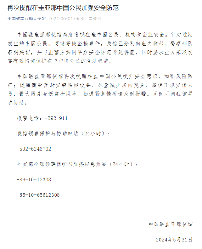 中國(guó)駐圭亞那大使館5月31日公告稱(chēng),中國(guó)駐圭亞那使館高度重視在圭中國(guó)公民、機(jī)構(gòu)和企業(yè)安全。針對(duì)近期發(fā)生的中國(guó)公民、商舖等被盜搶事件,我館已分別向圭內(nèi)政部、警察部隊(duì)表明關(guān)切,並與圭警方共同舉辦安全防範(fàn)專(zhuān)題講座,同時(shí)要求圭方採(cǎi)取切實(shí)有效措施保護(hù)在圭中國(guó)公民的合法權(quán)益。