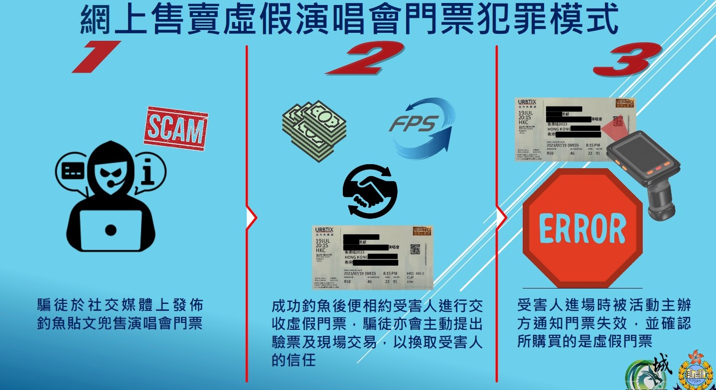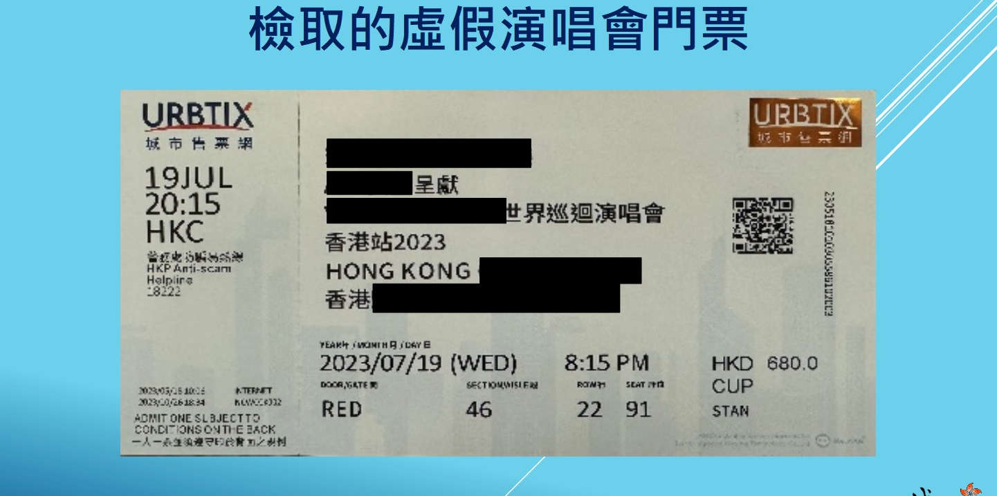 警方交待一宗騙徒出售鄭秀文演唱會(huì)虛假門票案。九龍城區(qū)刑事總督察陳海量今日(23日)表示,近日接獲多宗報(bào)案,指市民分別在網(wǎng)上和表演場(chǎng)館外,以現(xiàn)金或網(wǎng)上轉(zhuǎn)賬的方式購買表演活動(dòng)門票,其後在進(jìn)場(chǎng)時(shí)被場(chǎng)所職員告知門票失效,並確認(rèn)所購買是虛假門票。