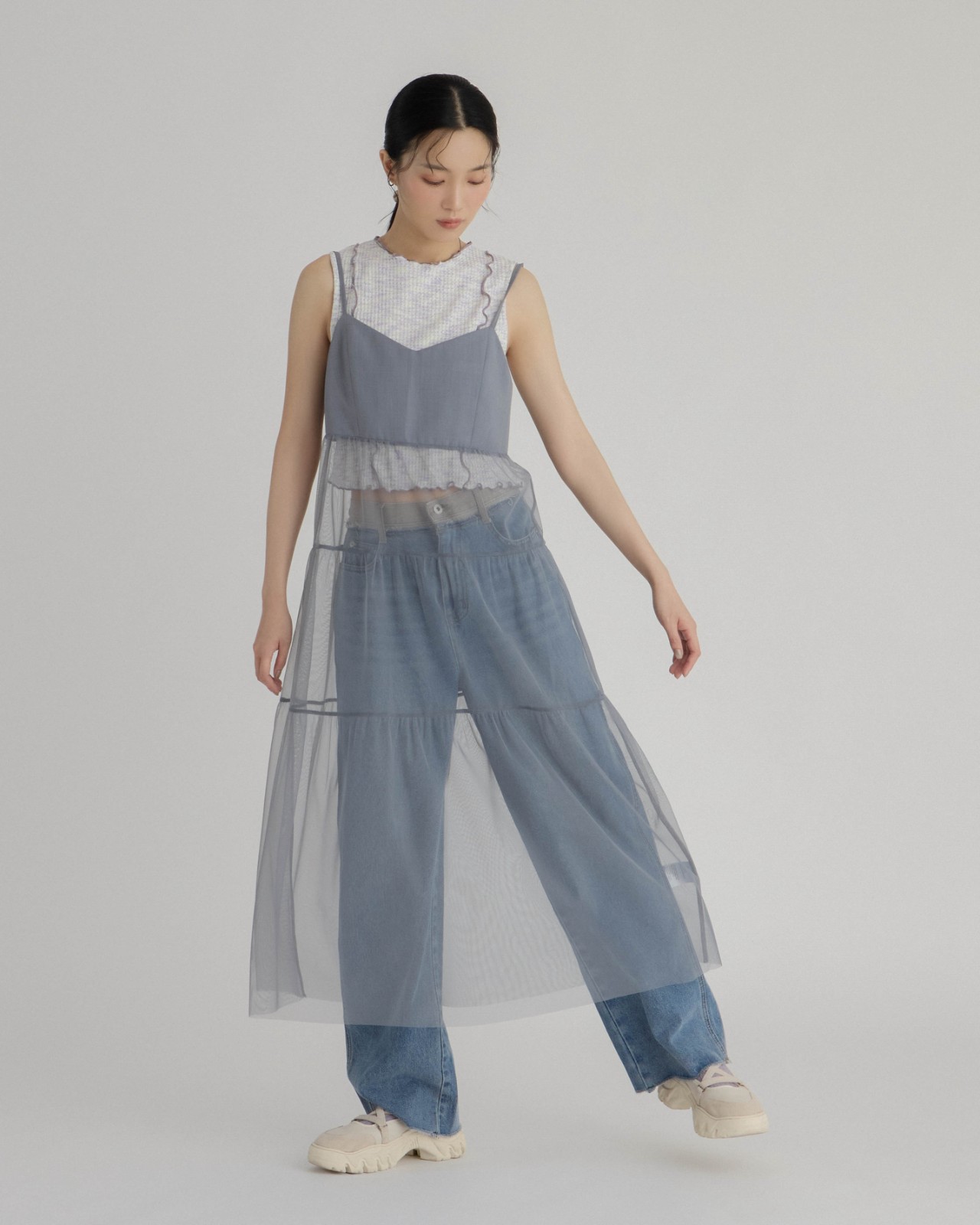 吊帶網(wǎng)紗連身裙,HK$499。寬鬆牛仔長褲,HK$399。