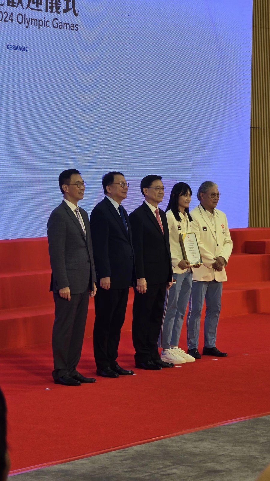 今屆巴黎奧運中國香港代表團(tuán)取得2金2銅歷史佳績,一眾運動員及代表團(tuán)成員今早(21日)巴士巡遊與巿民近距離接觸,並出席禮賓府歡迎午宴後,政府下午3時在政府總部舉行返港歡迎儀式,並頒發(fā)獎狀。大會在奏唱國歌後先播放江旻憓、張家朗、何詩蓓勇奪獎牌,及其他港隊運動員出賽精華片段。行政長官李家超致辭時表示,熱烈歡迎巴黎奧運會的中國香港代表團(tuán)成員滿載而歸。今屆巴黎奧運港隊每位成員全面發(fā)揮拼搏精神和專業(yè)態(tài)度,向全世界展示香港人拼搏進(jìn)取、遇強(qiáng)越強(qiáng)的香港精神,帶給全港市民振奮的好成績,每位運動員都是香港市民心中的英雄!