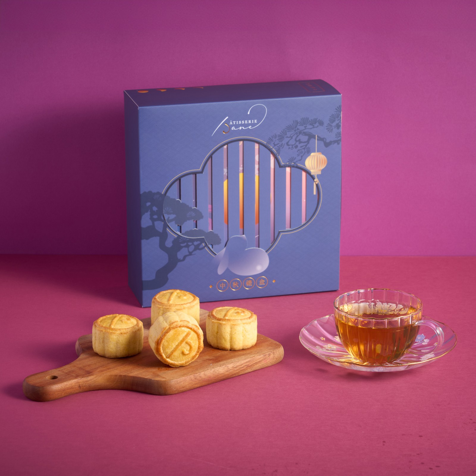 店舖的月餅禮盒系列以高貴優(yōu)雅的紫藍色為主調(diào),充滿紙藝技術,盒面以光柵動畫為靈感,抽出封套能展現(xiàn)佳節(jié)月圓,與玉兔相映成趣,旁有燈籠及松樹作點綴,送禮體面。每件月餅均為獨立包裝,盒上印有四款不同的月相,代表月有陰晴圓缺,總會迎來滿月時刻。