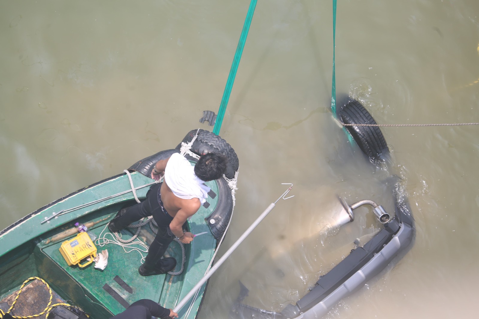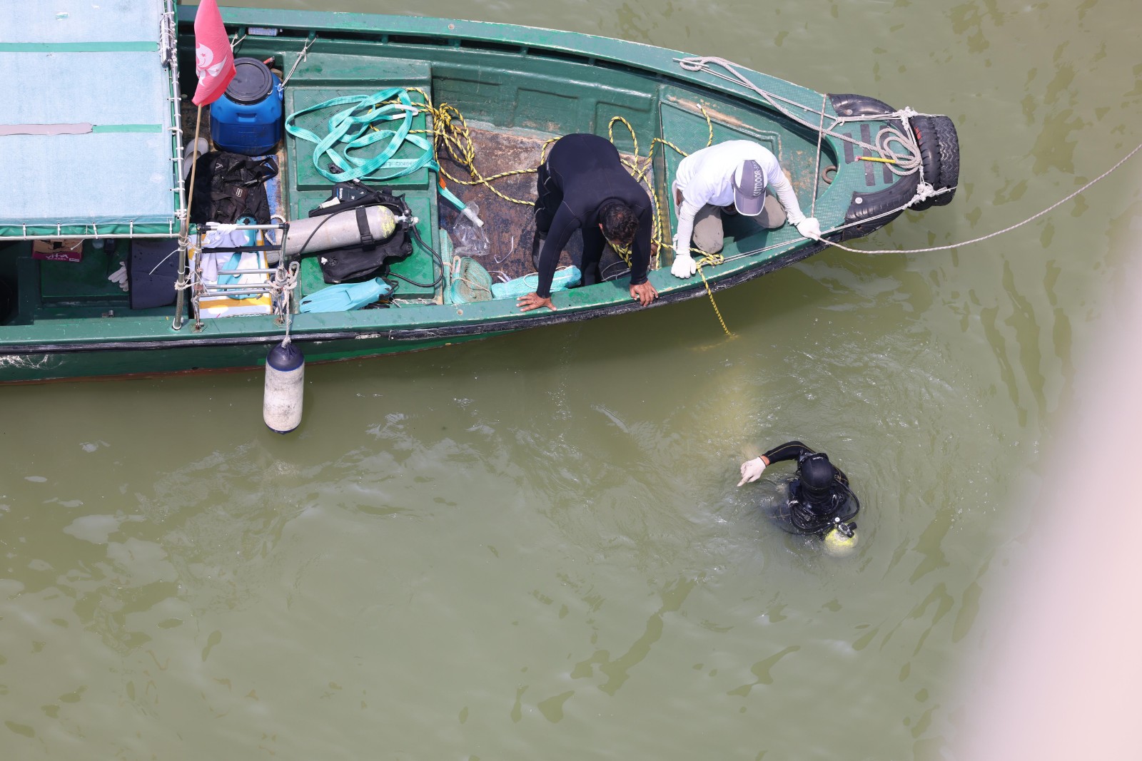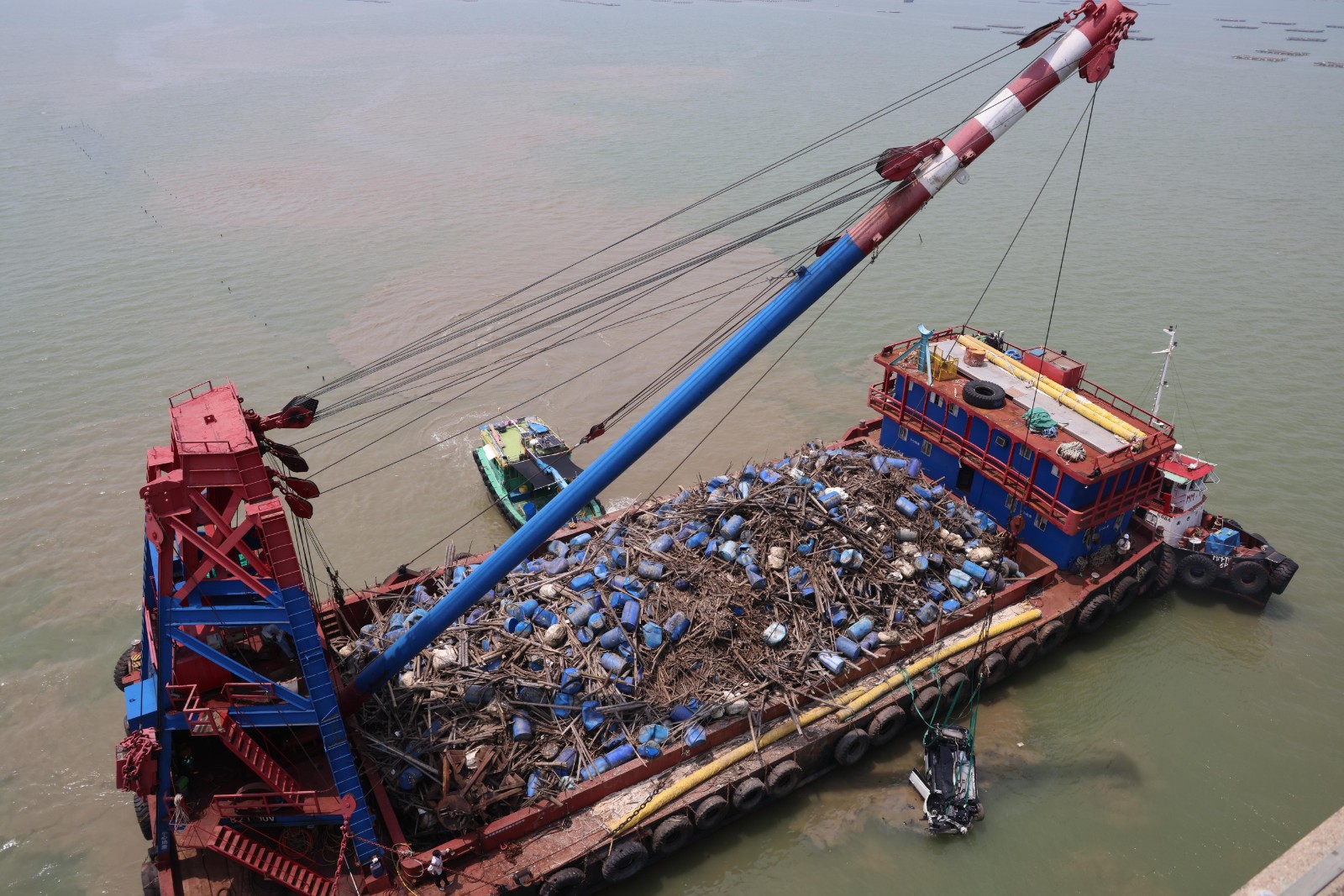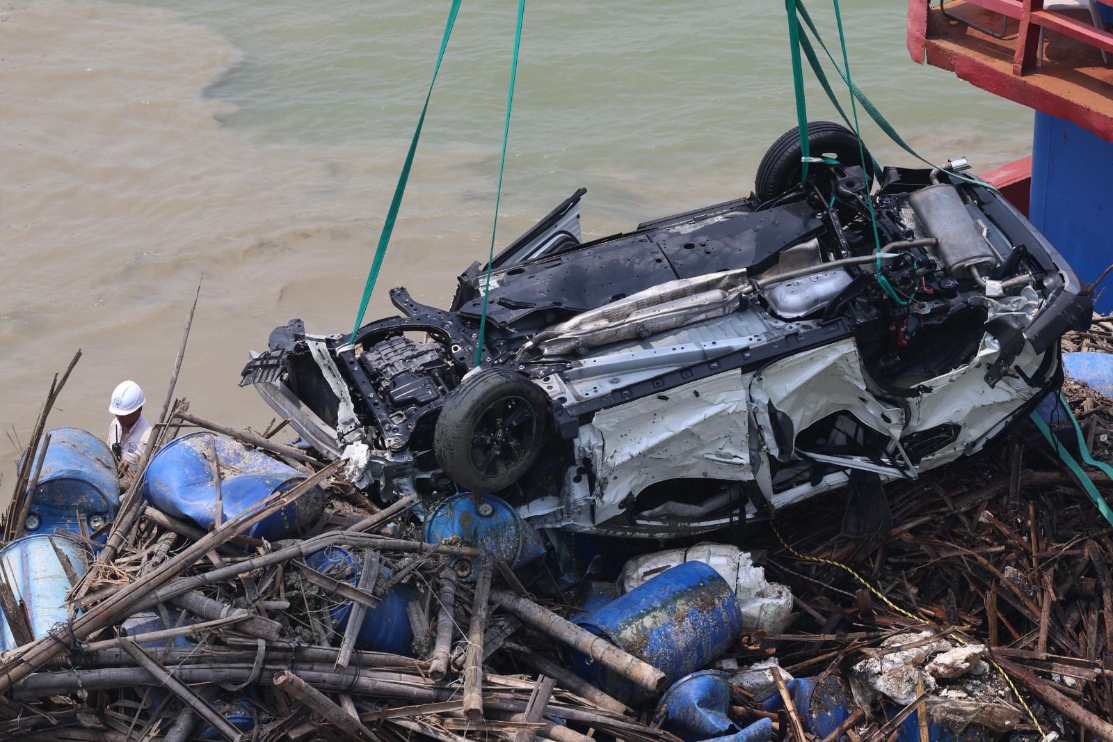 一名海關(guān)關(guān)員昨晚(2日)駕車上班途中在深圳灣大橋懷疑失控,連人帶車飛越橋邊欄桿墮海,消防蛙人救出傷者送院搶救,最終救治無效死亡。警方今早(3日)9時許安排躉船到場打撈肇事私家車,但因退潮現(xiàn)場海面水深不足,延至中午12時躉船駛近事發(fā)海面,蛙人落海綁緊私家車固定後,將車吊上躉船。