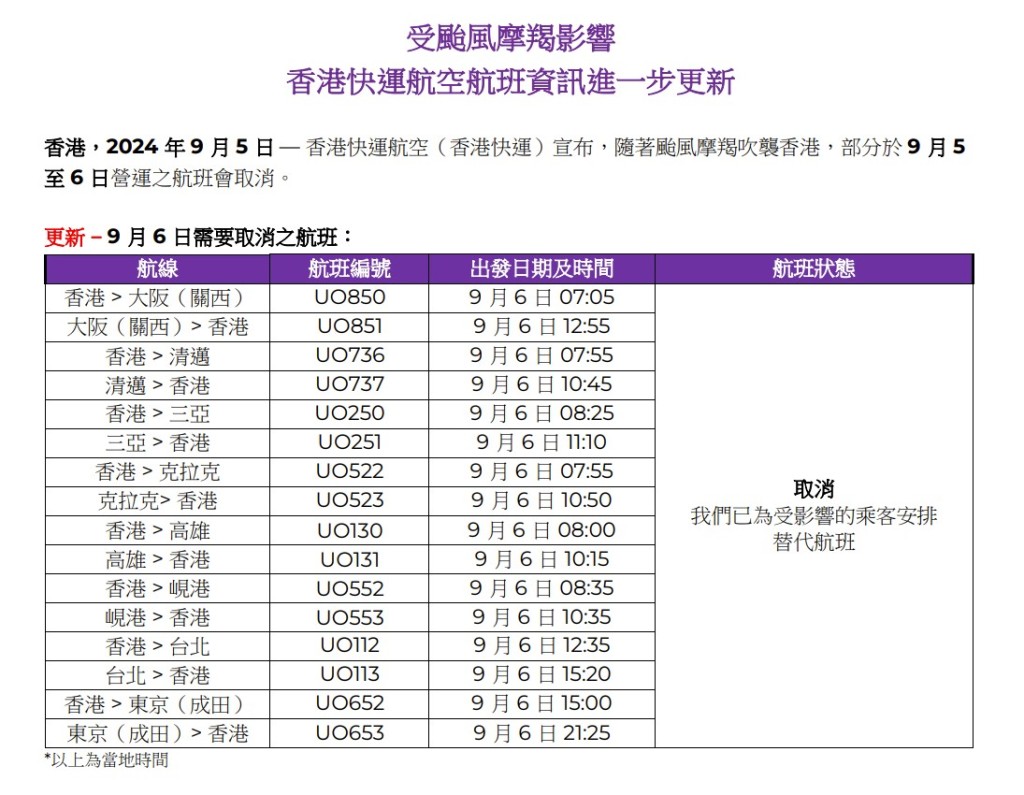 9月6日凌晨12時05分由香港往馬尼拉的HB231航班,最新出發(fā)時間改為9月7日凌晨12時05分;9月6日凌晨3時10分由馬尼拉往香港的HB232航班,最新出發(fā)時間改為9月7日凌晨3時10分。