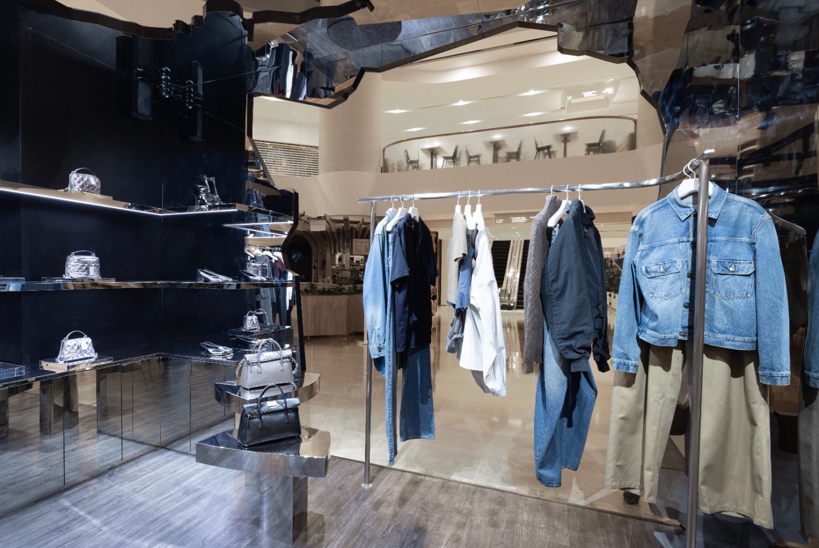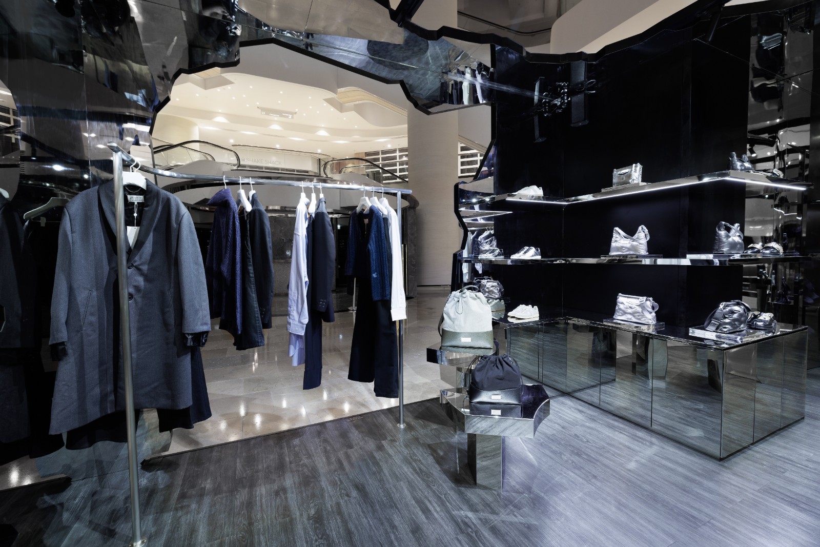香港是品牌首個(gè)以Broken Mirror為設(shè)計(jì)概念,打造限定店的城市。限定店恍如巨大裂開的鏡面方塊準(zhǔn)備瓦解,露出暗黑複雜的內(nèi)在,店內(nèi)包括木地板及鏡面不銹鋼結(jié)構(gòu)。走進(jìn)內(nèi)裏能聽到鏡面破碎的聲音微微響起,感受鏡面裂開瞬間的詩(shī)意,帶來(lái)沉浸式體驗(yàn)。