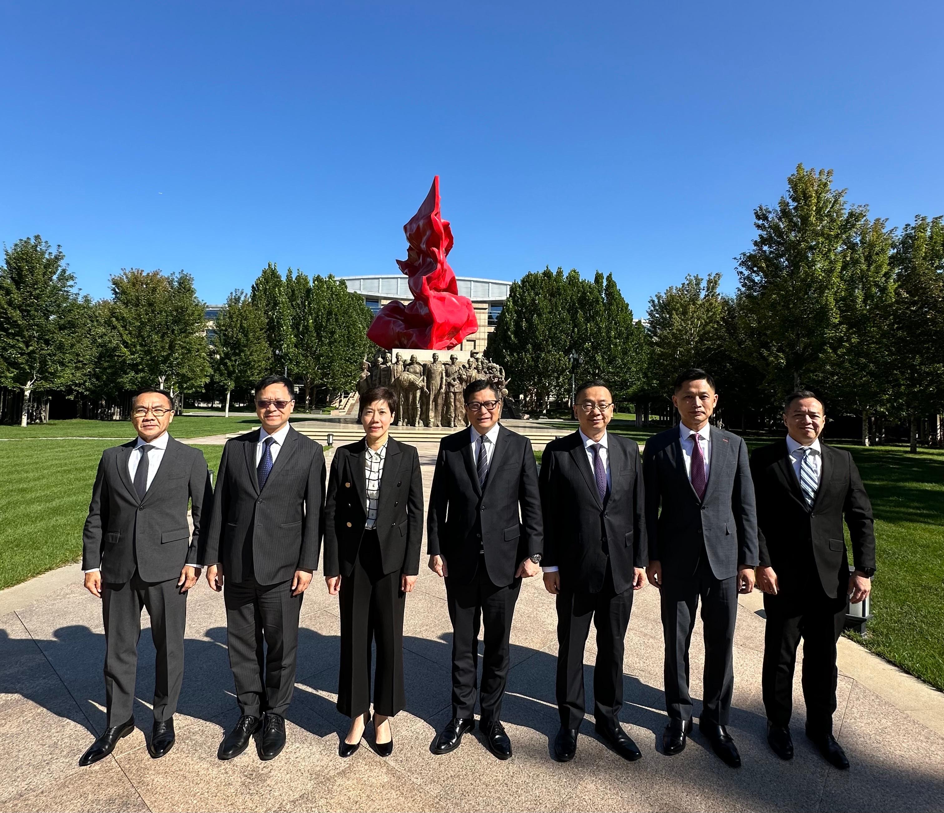 鄧炳強(qiáng)(左五)與中央港澳工作辦公室主任、國務(wù)院港澳事務(wù)辦公室主任夏寶龍(中)、國務(wù)院港澳事務(wù)辦公室副主任農(nóng)融(左四)、中央人民政府駐香港特別行政區(qū)聯(lián)絡(luò)辦公室副主任羅永綱(右四)及交流團(tuán)成員合照。