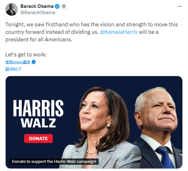當(dāng)?shù)貢r(shí)間9月10日晚,美國(guó)前總統(tǒng)、共和黨總統(tǒng)候選人特朗普同美國(guó)副總統(tǒng)、民主黨總統(tǒng)候選人賀錦麗參加由美國(guó)廣播公司(ABC)在費(fèi)城舉辦的電視辯論。辯論結(jié)束後,美國(guó)前總統(tǒng)奧巴馬在社交平臺(tái)上表示,今晚大家親眼目睹了誰(shuí)擁有推動(dòng)這個(gè)國(guó)家前進(jìn)而不是分裂國(guó)家的遠(yuǎn)見和力量。賀錦麗將成為所有美國(guó)人的總統(tǒng)。