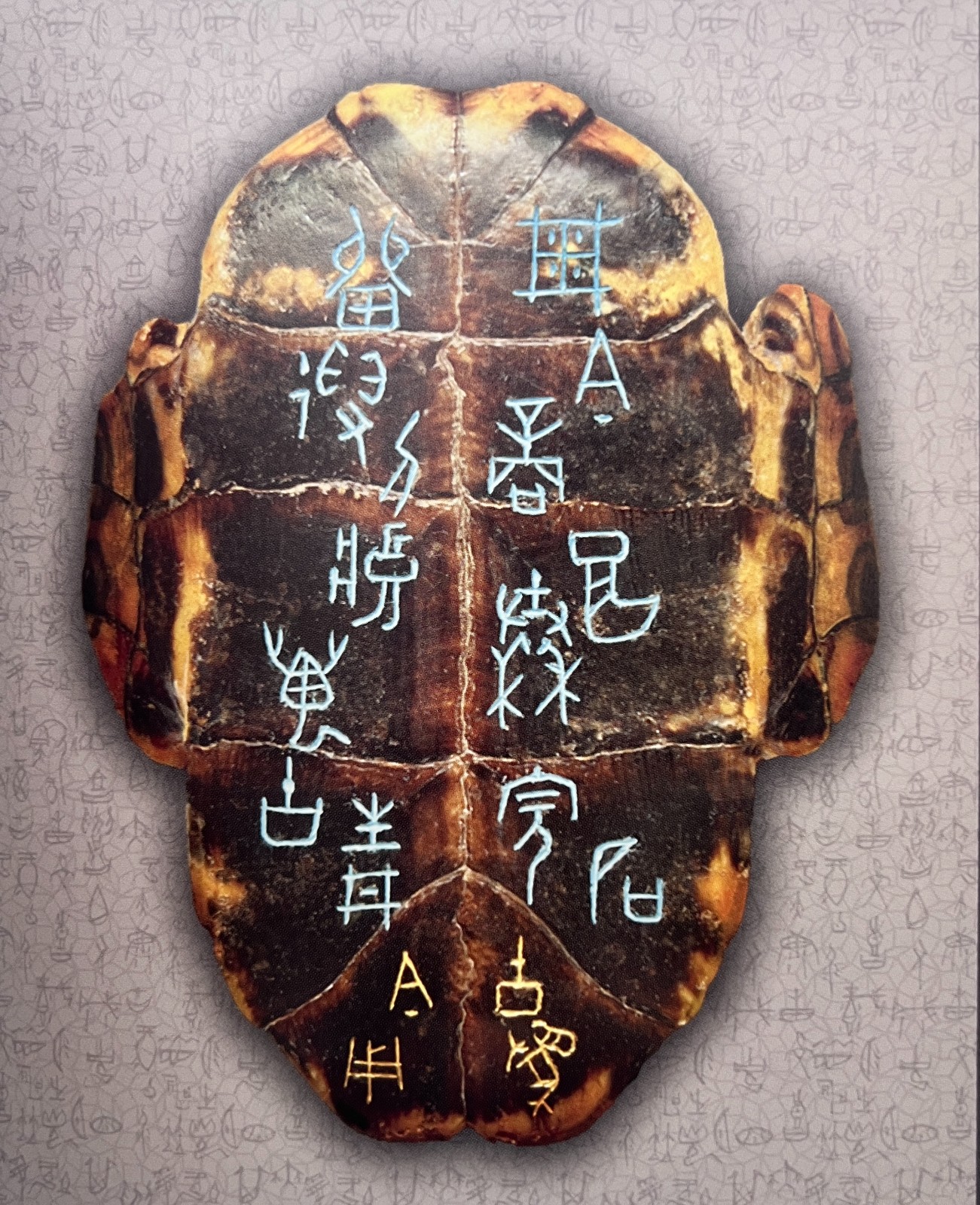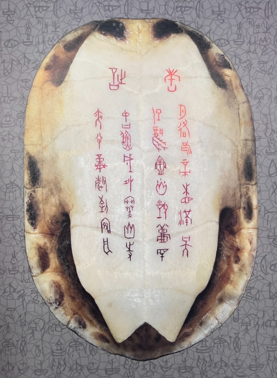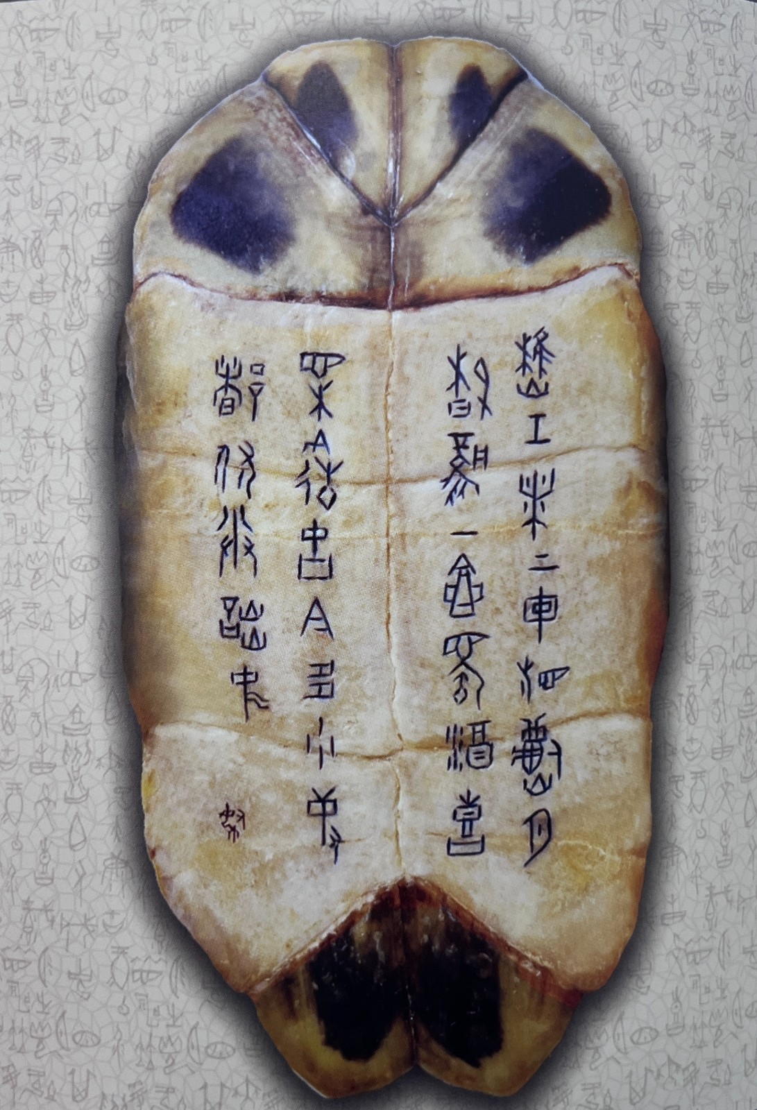 除傳承外,中帑加入許多創(chuàng)新元素。利用收集來的龜背、龜板上不同天然紋理,配合刻上的甲骨文字,在章法布局上有別於傳統(tǒng)的甲骨文書法,凸顯了氣韻生動,並在篆刻文字上塗了不同色彩,增加現(xiàn)代氣息、藝術(shù)感及可讀性。