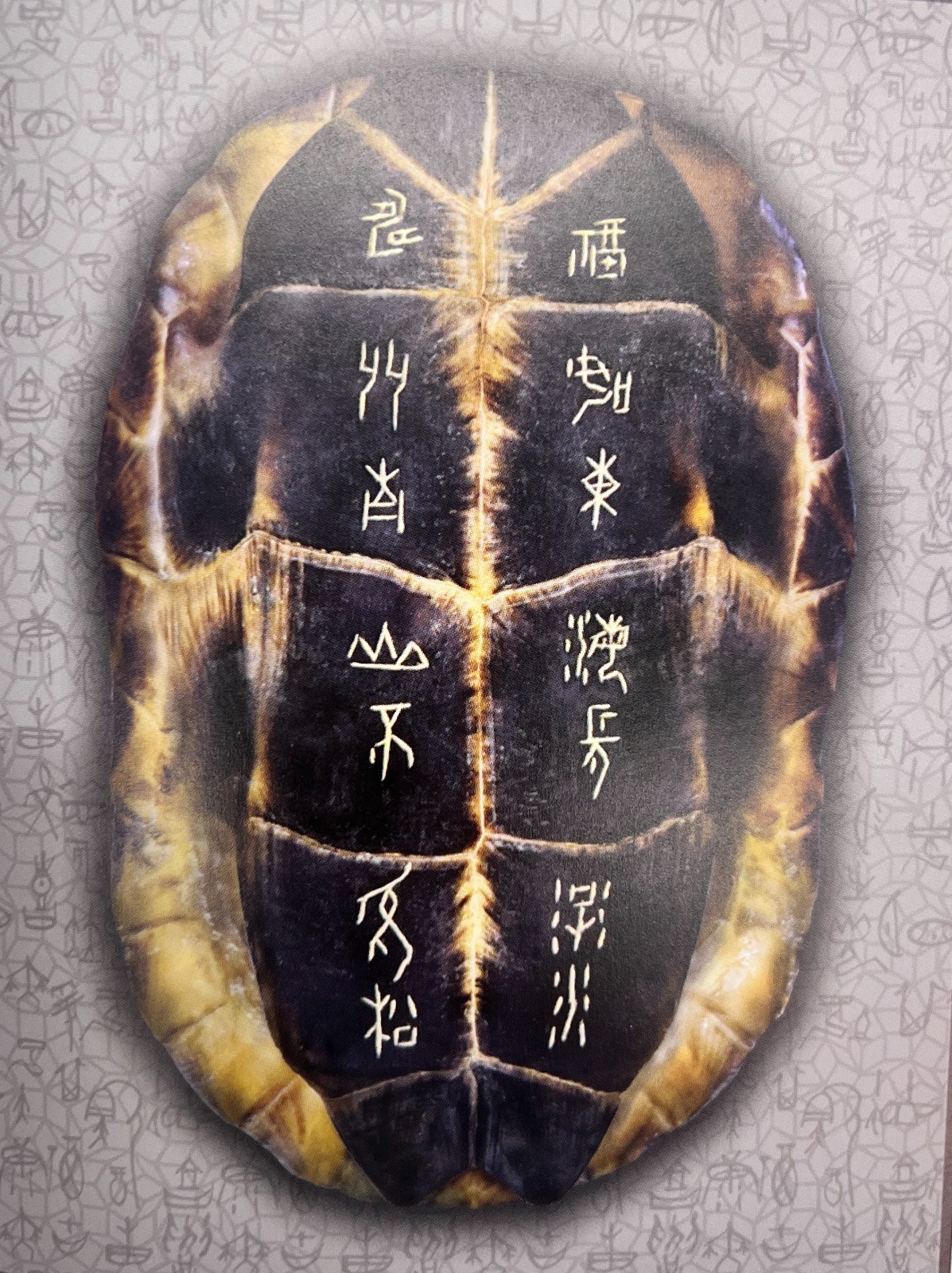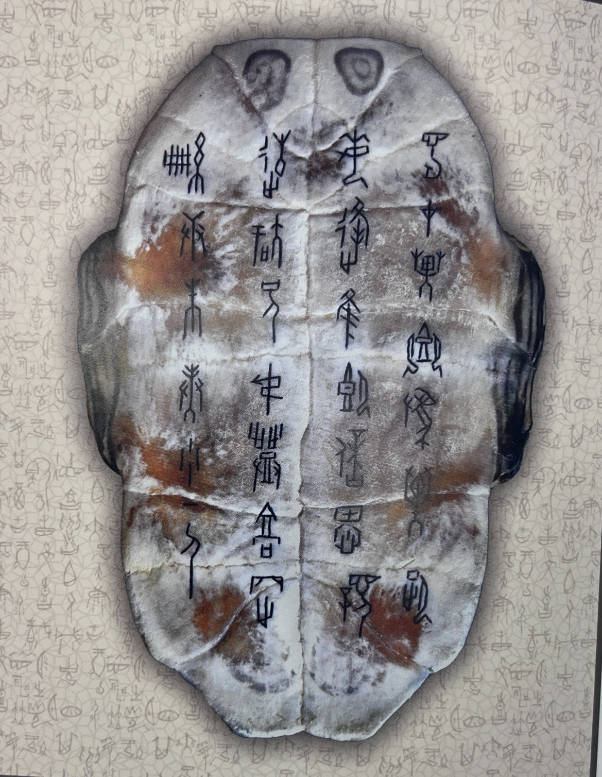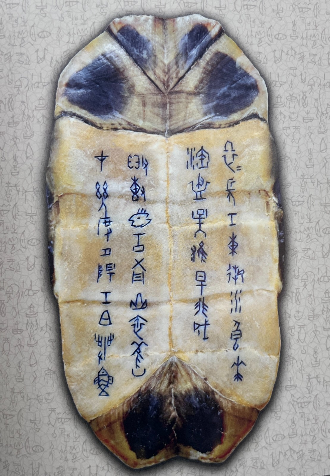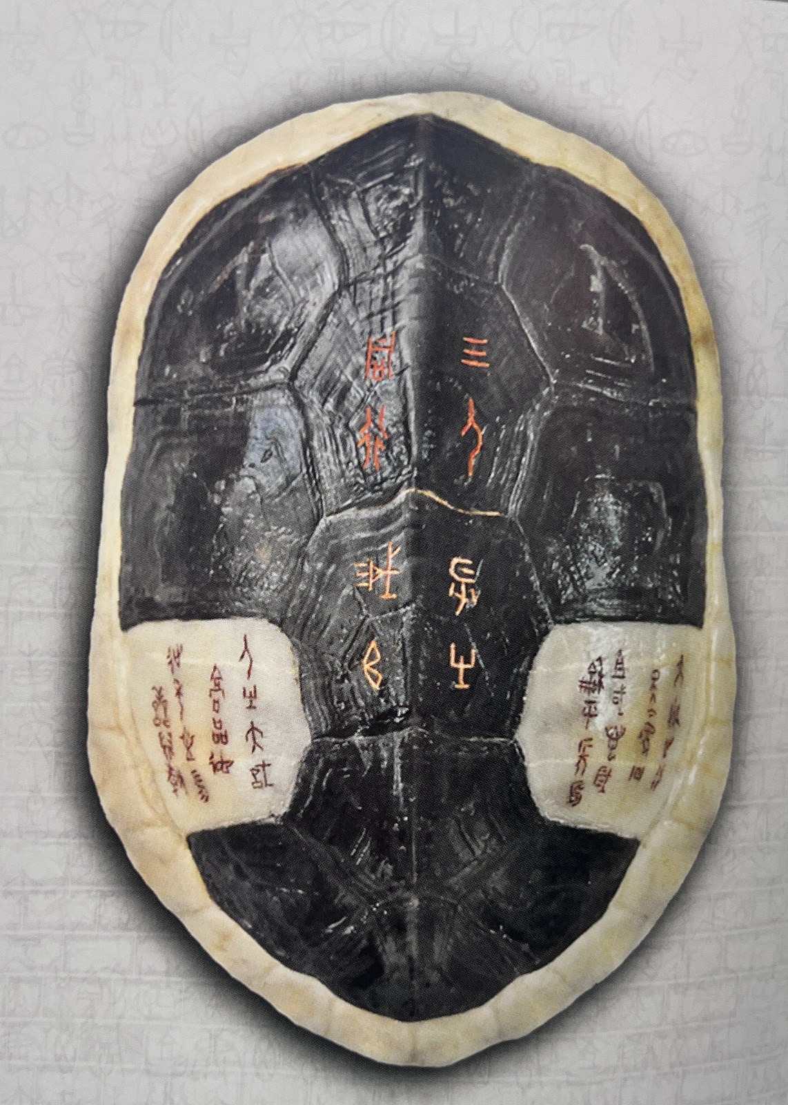除傳承外,中帑加入許多創(chuàng)新元素。利用收集來的龜背、龜板上不同天然紋理,配合刻上的甲骨文字,在章法布局上有別於傳統(tǒng)的甲骨文書法,凸顯了氣韻生動,並在篆刻文字上塗了不同色彩,增加現(xiàn)代氣息、藝術(shù)感及可讀性。