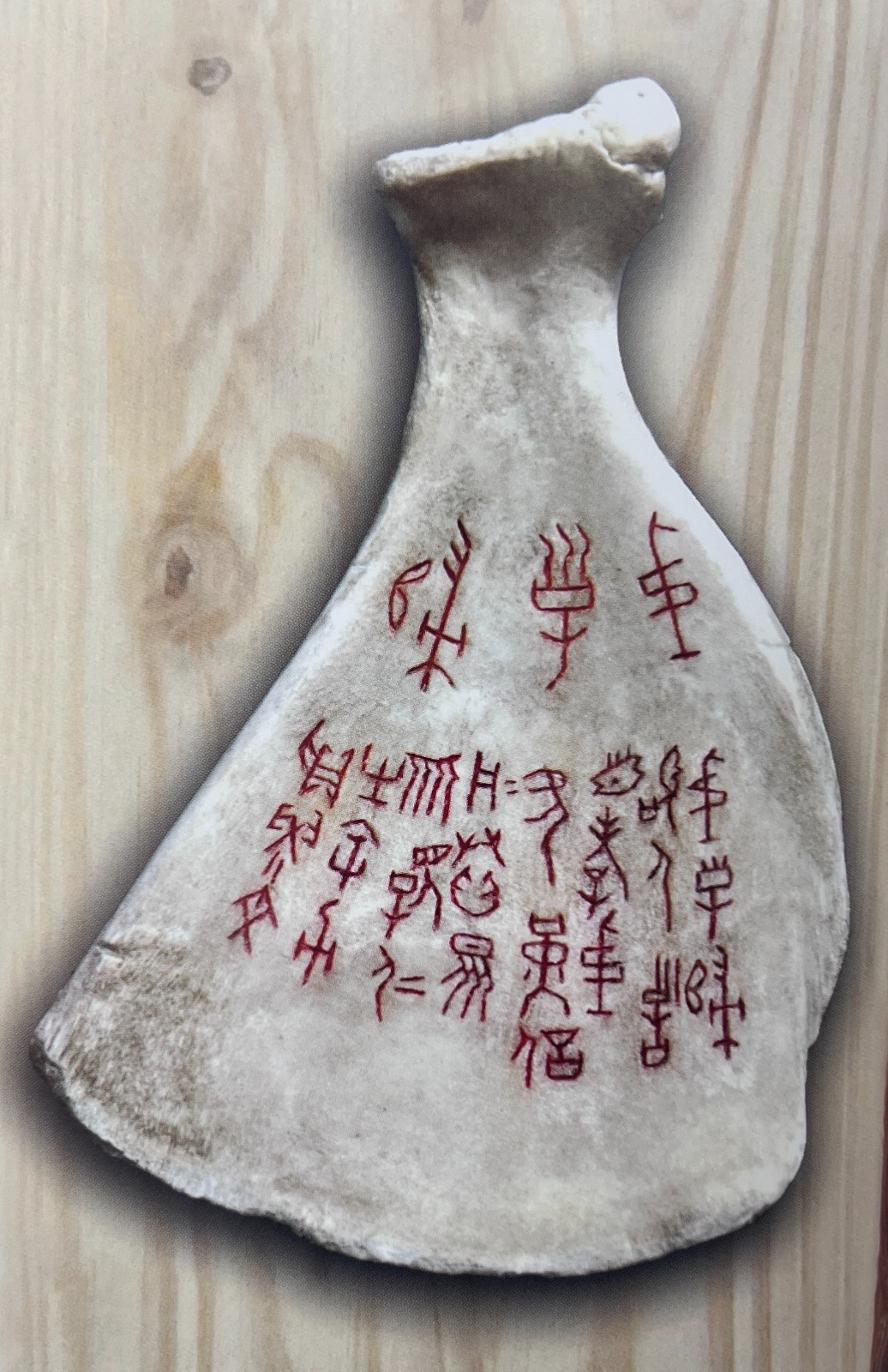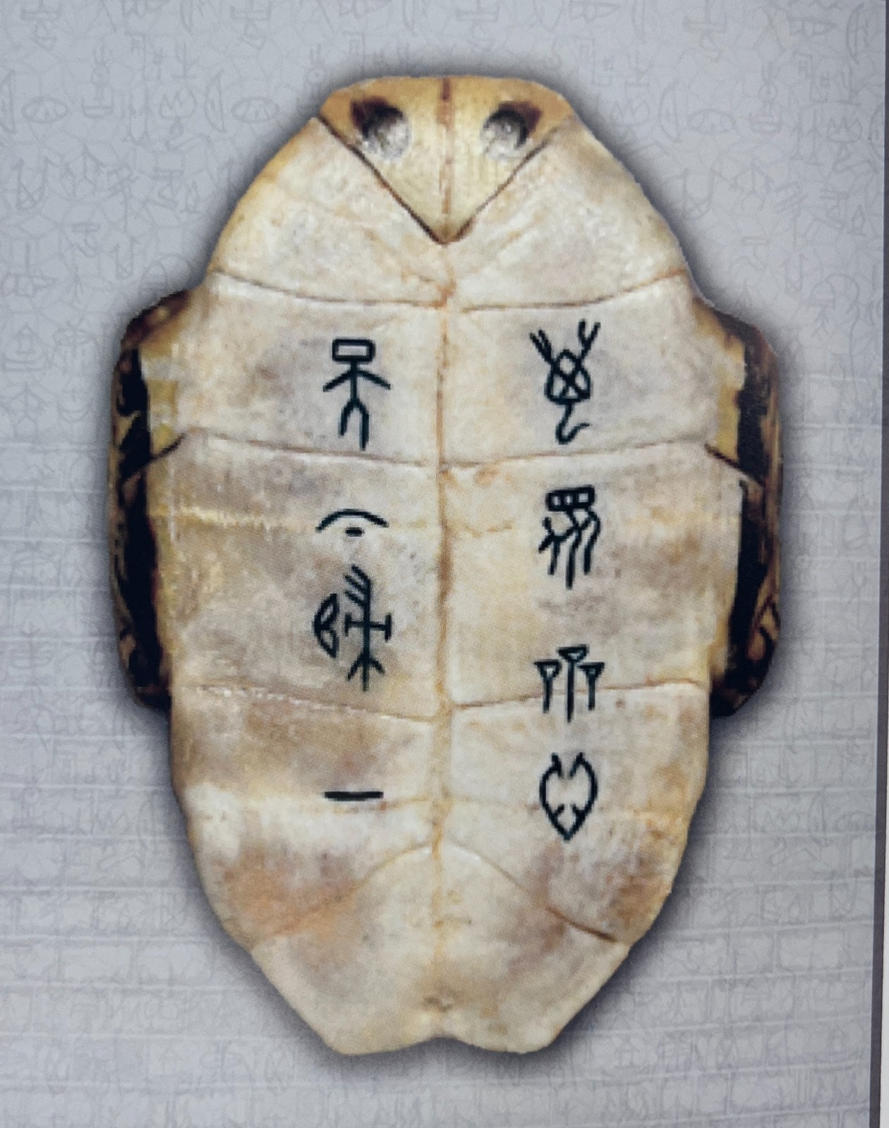 甲骨文為中國在數(shù)千年前刻在龜甲或動物骨上的古文字,但由於年代久遠(yuǎn),直至19世紀(jì)末在安陽出土,能識辨的只有一千多字,要用甲骨文書寫近代詩句便有很多限制。面對甲骨文字檔庫不足的問題,中帑背後作不少考究、參照、思考。加上載體面積有限,其作品多選取言簡意賅的成語、諺語或摘錄自詩文的短句。部分龜甲篆刻,特意選在安陽出土甲骨上的文字,讓現(xiàn)代人體會到數(shù)千年前刻在甲骨的文體風(fēng)格及題材。