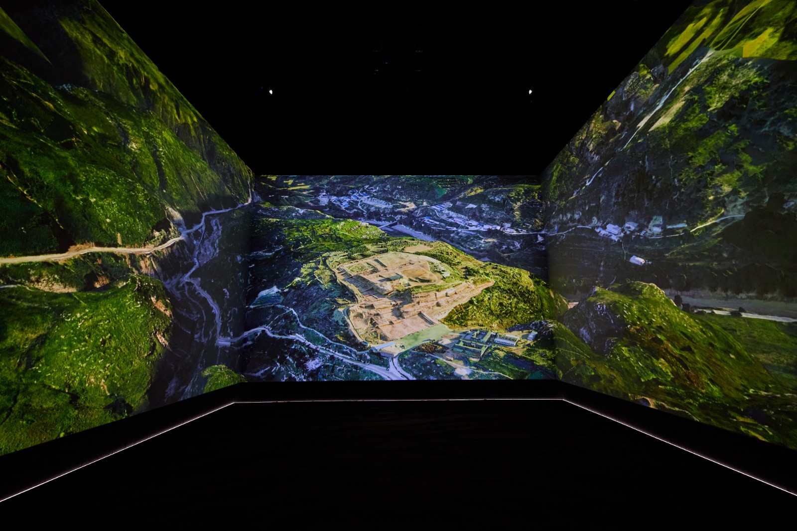展覽特別設(shè)計一處沉浸式多媒體裝置,讓觀眾彷彿置身於石峁遺址之中。這一裝置通過270度全景銀幕,將石峁古城的壯麗景象生動呈現(xiàn)。觀眾不僅可以看到城牆的恢弘,還能感受到當(dāng)時人們的生活氛圍。