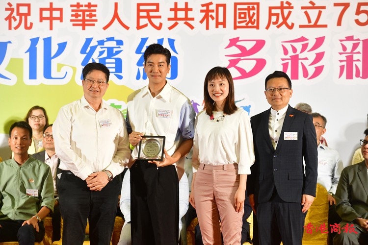 新界社團聯會副會長羅競成(左一)、創(chuàng)新科技及工業(yè)局副局長張曼莉(右二)與新界社團聯會會長陳勇(右一)向「葵青區(qū)體育節(jié)2024」體育之星黎諾懿(左二)頒發(fā)感謝狀。