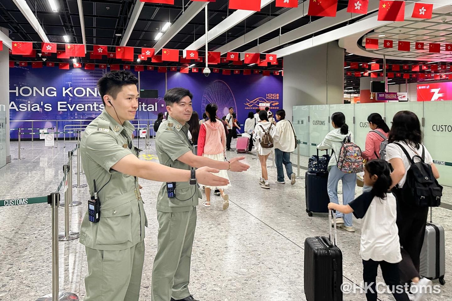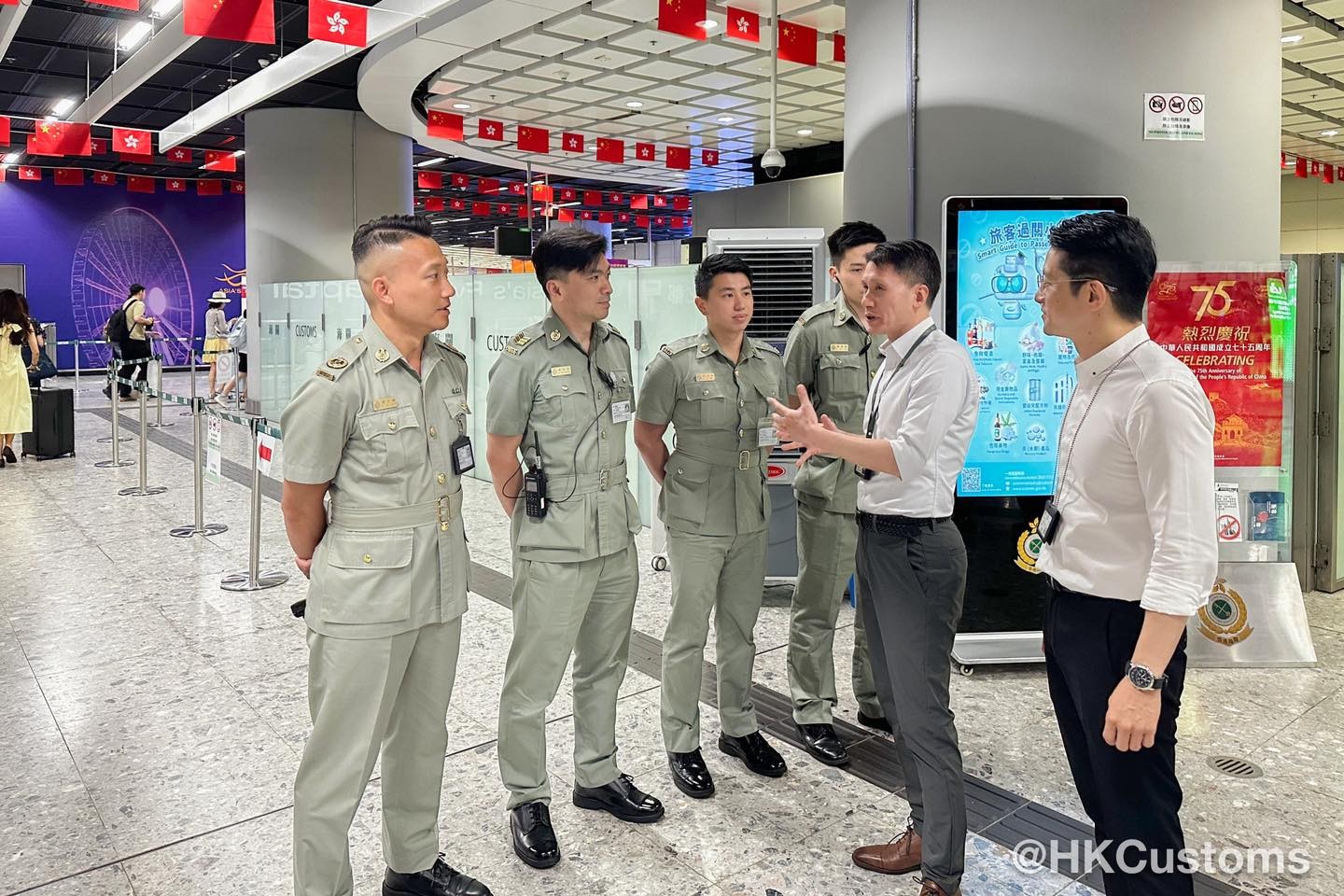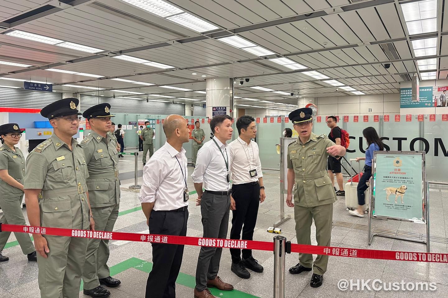 為迎接內(nèi)地國慶黃金周訪港旅客及應(yīng)對(duì)長假期的人流車流,海關(guān)人員緊守崗位,與各部門通力合作,加強(qiáng)各口岸清關(guān)工作,確保通關(guān)暢順。海關(guān)副關(guān)長(管制及執(zhí)法)胡偉軍與海關(guān)助理關(guān)長(邊境及港口)朱沛?zhèn)?,今日?日)早上到深圳灣口岸及高鐵西九龍管制站了解口岸運(yùn)作情況,並為當(dāng)值前線海關(guān)人員打氣。