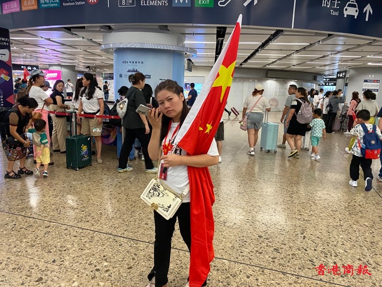 拿著大國旗過關(guān)的胡小姐來自桂林,他與100多位團友一起來港參加中國樂器比賽,為令團友容易識別所以拿著大國旗。她說:「我第一次來港,以為拿著大國旗會讓大家容易辯認,怎料很多其他旅客也同樣這樣做,哈哈!國慶節(jié)大家都希望透過這種方法來慶祝。今次3天行程,除了一天比賽,其餘時間會到紫荊廣場、廟街及到中環(huán)坐觀光巴士?!?/p>