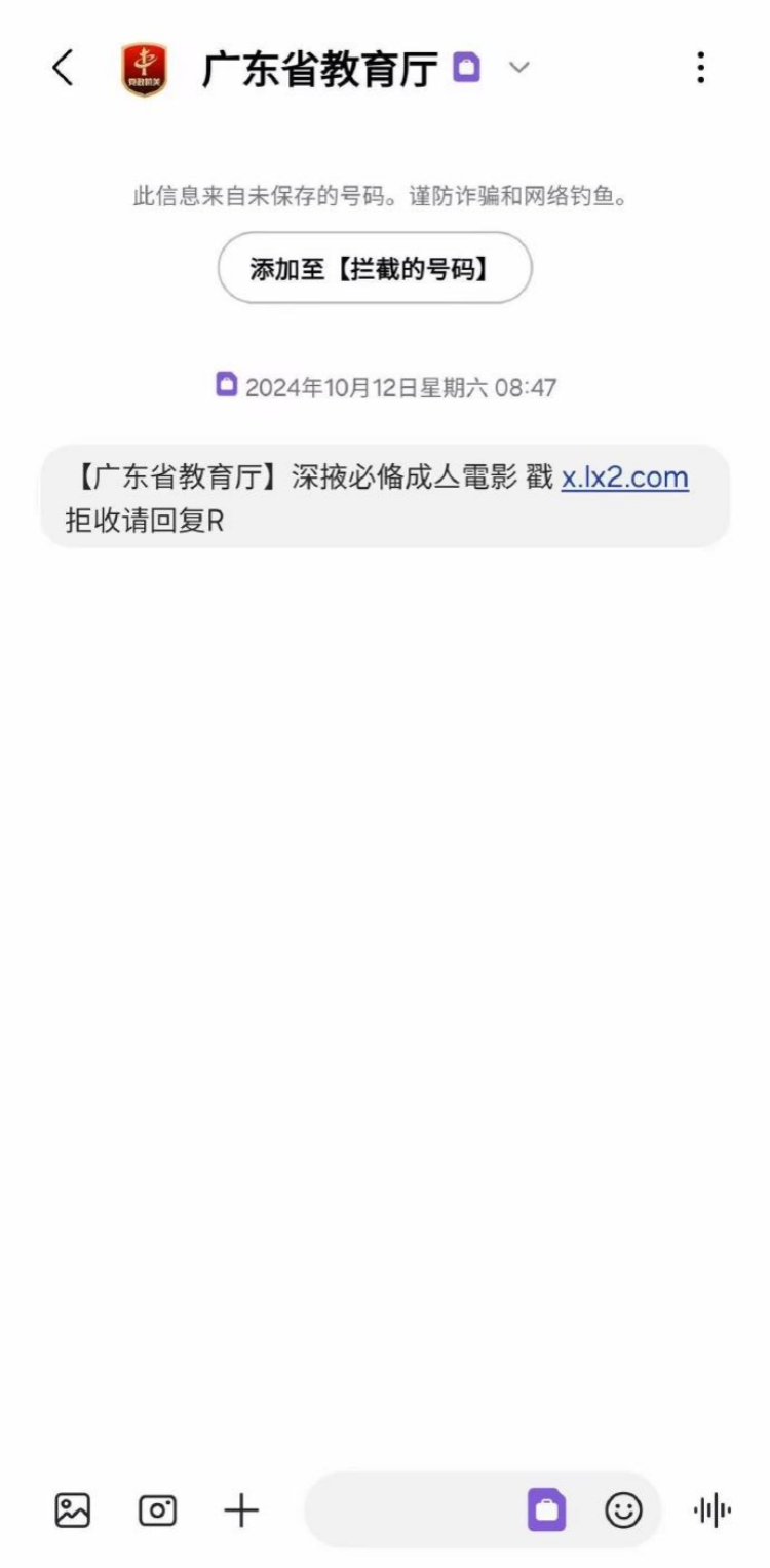10月12日,眾多內(nèi)地網(wǎng)友在社交媒體發(fā)文表示,廣東省教育廳竟向自己發(fā)送帶有不法鏈接的短信,更以亂碼編排「成人電影」字樣誘惑,難以置信。