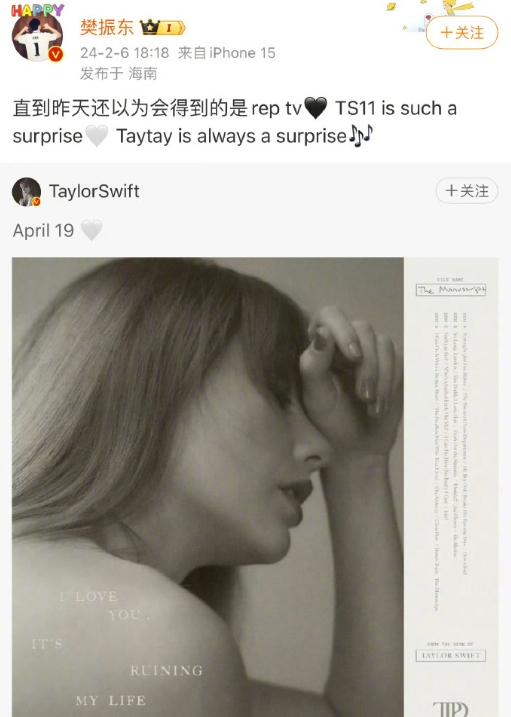 樊振東是流行巨星泰勒·斯威夫特(霉霉)的忠實粉絲,他曾在多個場合公開表明自己的「霉粉」身份。他在巴黎奧運奪得乒乓男單冠軍後,發(fā)布的第一條微博就是分享了「霉霉」的歌曲《The Alchemy》,他在「霉霉」演唱會高聲跟唱的視頻也廣為流傳。