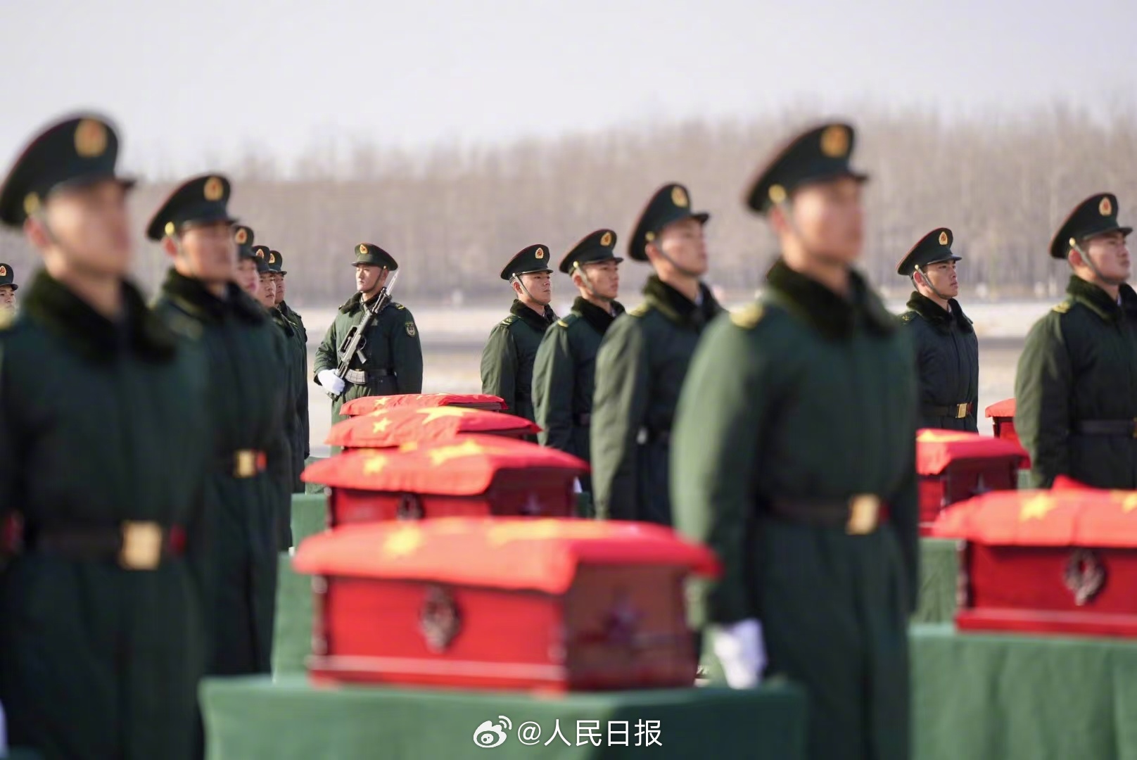 裝殮儀式後,中韓雙方共同將烈士遺骸棺槨運送至韓國仁川國際機場。中方在仁川國際機場停機坪現(xiàn)場舉行莊嚴(yán)悼念儀式,中方人員激揚唱響雄壯的中華人民共和國國歌,中國駐韓國使館臨時代辦方坤為志願軍烈士遺骸棺槨一一覆蓋國旗,全體人員向志願軍烈士行三鞠躬禮,中國人民解放軍儀仗司禮大隊禮兵手持國旗領(lǐng)路,護(hù)送烈士遺骸棺槨登上解放軍空軍「運-20」專機。
