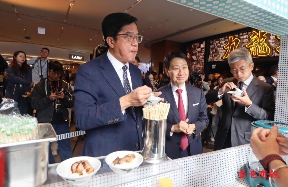 財政司副司長黃偉綸對手中的叉燒飯讚不絕口
