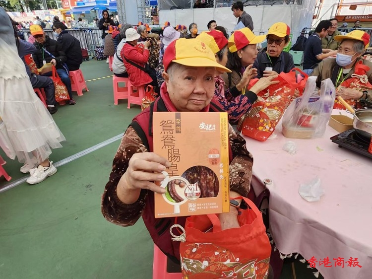 居於元朗的趙婆婆表示,在田家炳長(zhǎng)者鄰舍中心得悉有盆菜宴舉行,於是報(bào)名參加,是她首次參與盆菜宴,覺(jué)得氣氛很好,「有得食又有得拎(福袋)」,期待未來(lái)有類似的活動(dòng)舉辦。(記者/攝影 葉家亨)