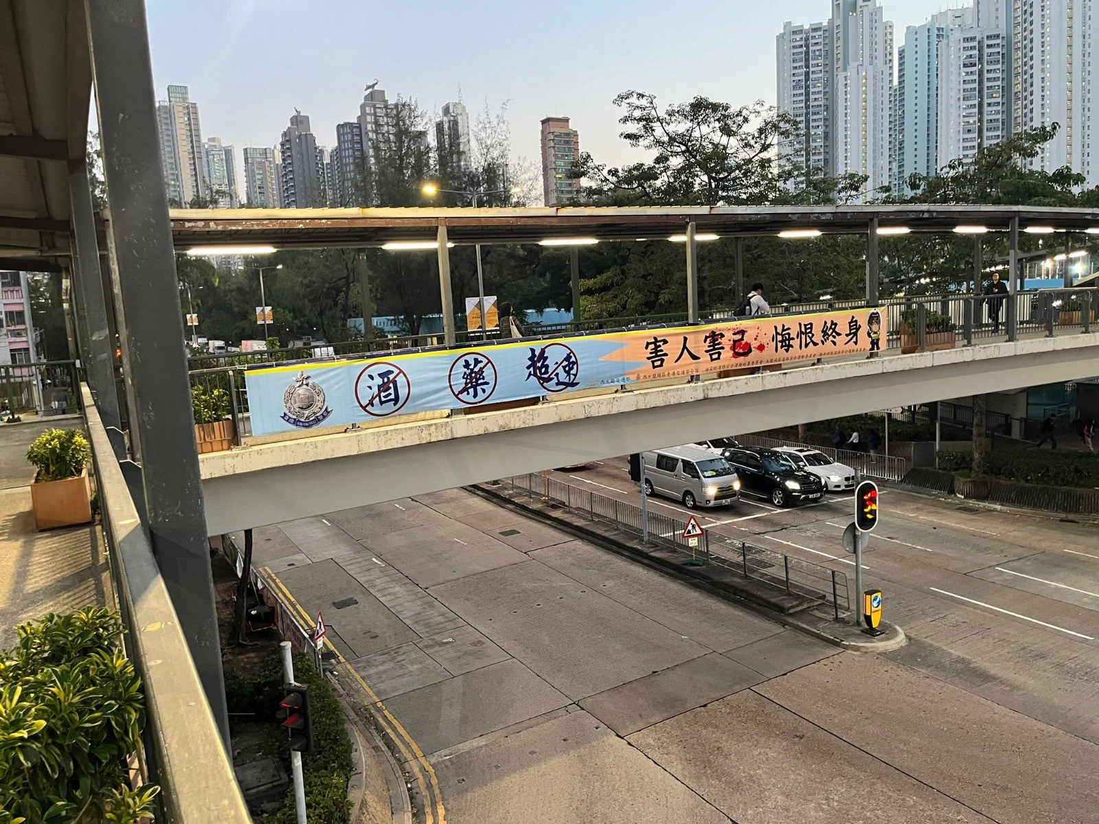 警方表示,因聖誕佳節(jié)臨近,西九龍交通部於12月起在窩打老道、龍翔道、彌敦道、荔枝角道、東九龍走廊等出入西九龍區(qū)的主要幹道、行人天橋上懸掛大型道路安全橫額,提醒司機切勿藥後、酒後或超速駕駛。