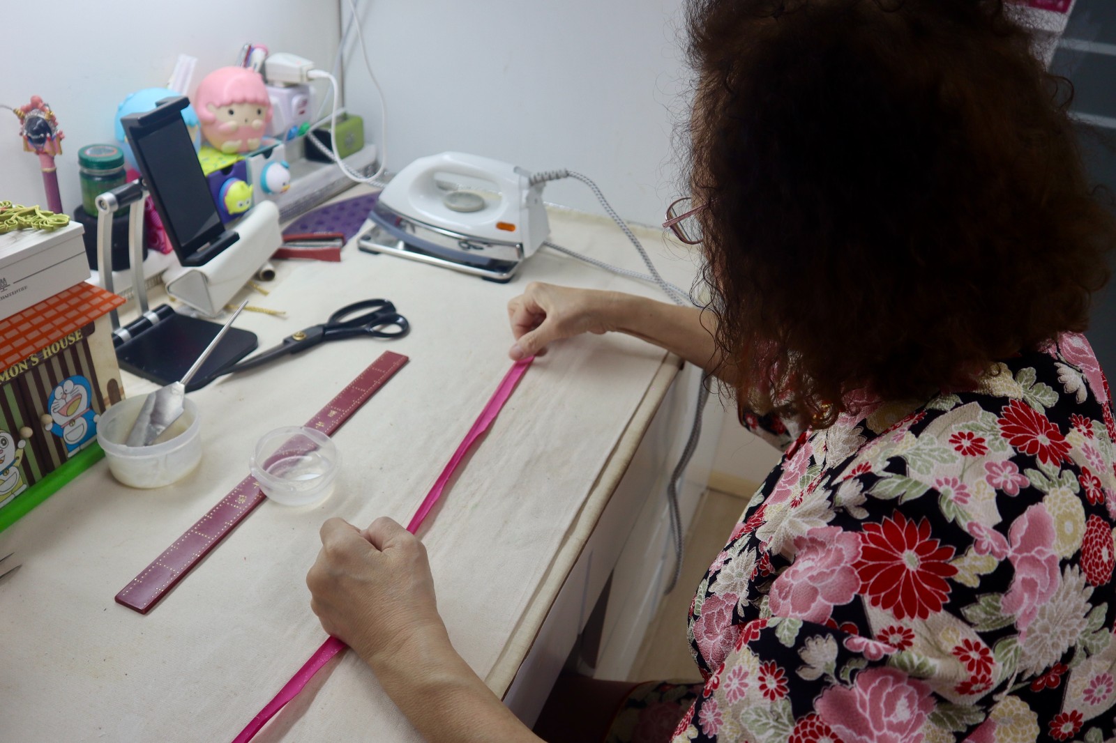 時代轉變不但反映在訂單之上,連帶做花紐的工具亦越見難尋?!敢酝牟剂腺|感柔順,紋理緊密,結實耐用?,F在有錢也買不到?!顾焓謸徇^桌邊一塊布料,「現在只能用光明絹這種布料代替,但它易起紋,質感差很遠?!蛊謳煾禑o奈地說:「上世紀六七十年代,彌敦道滿是布行,買料很方便,價格也便宜?!宫F在,浦師傅買布多數只能由萬邦綢緞進貨。不僅是布料,連製作工具也在時代的洪流中消失?!高@把鑷子,用了幾十年?!顾⌒囊硪淼啬闷痂囎樱敢郧暗匿撍|量好,特別耐用,現在的根本比不上。做鑷子的師傅早退休了,再找不到這樣的工具?!蛊謳煾稻従彽?,「不轉變就會停留在原地,一轉變,很多事都變了?!箤独弦淮炙嚾藖碚f,時代的變遷意味著生存環(huán)境的變化,新興行業(yè)逐漸取代傳統(tǒng)工藝,過去的輝煌不再,唯有珍惜眼前尚存的技藝,可以傳的,盡量傳承。
