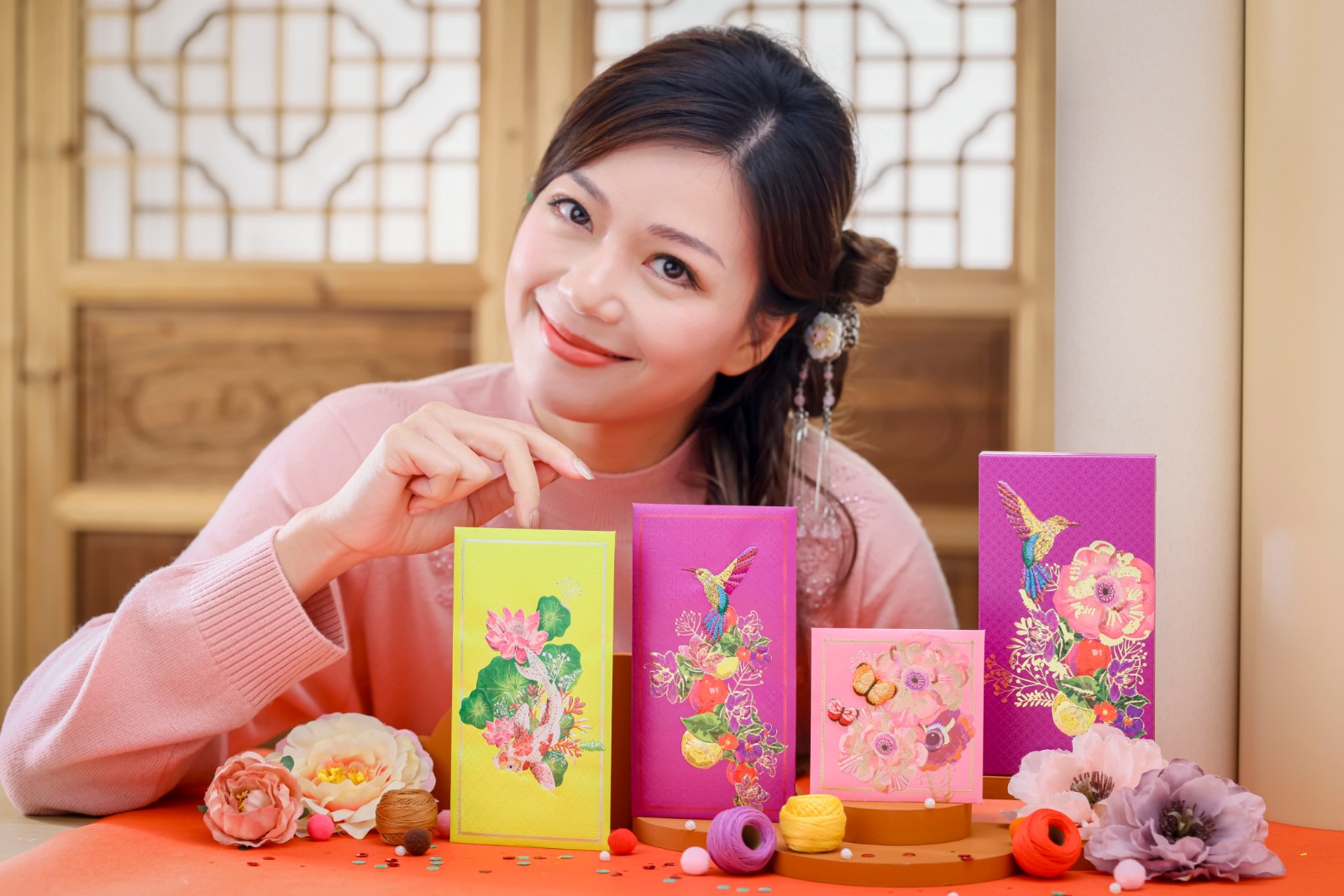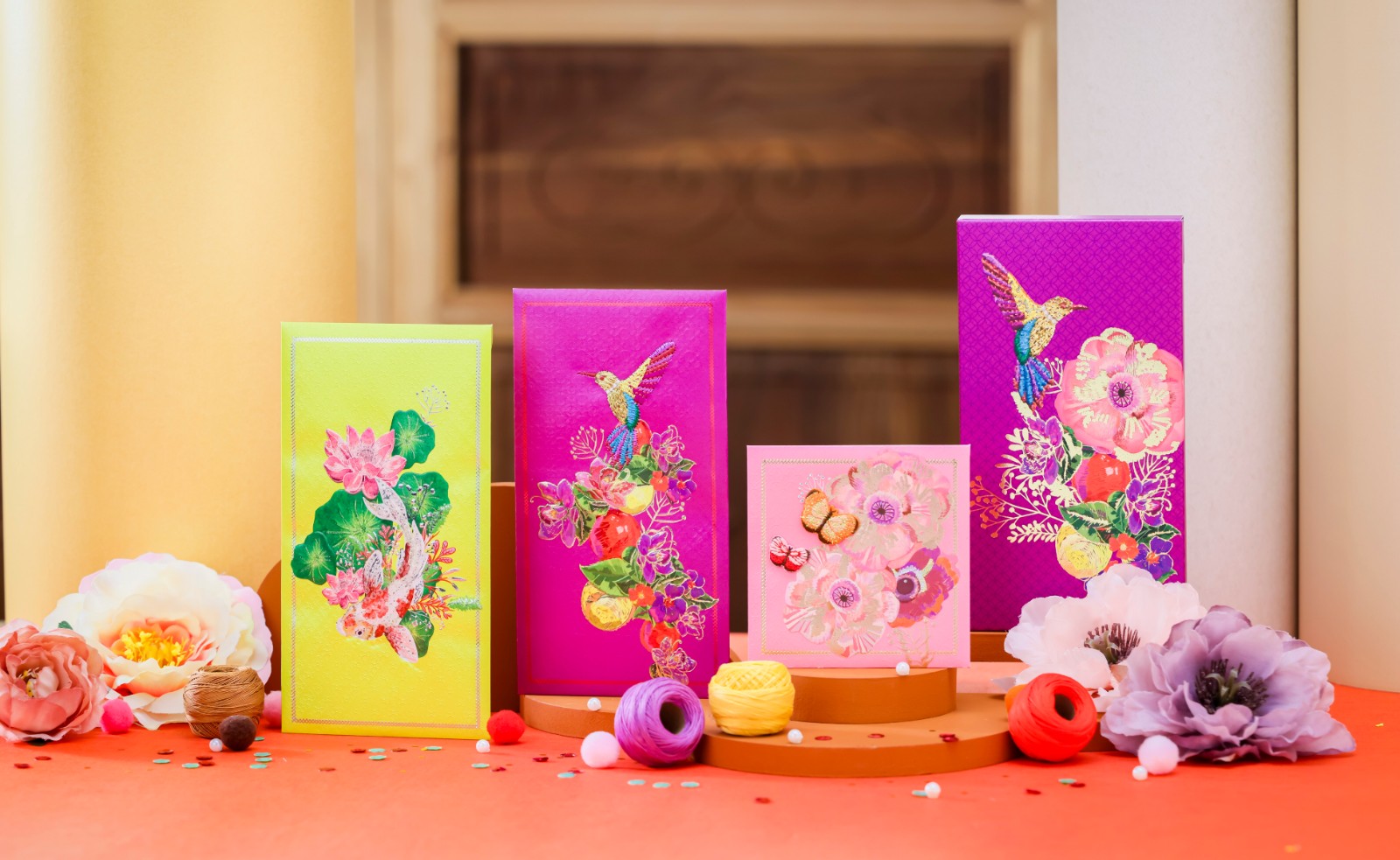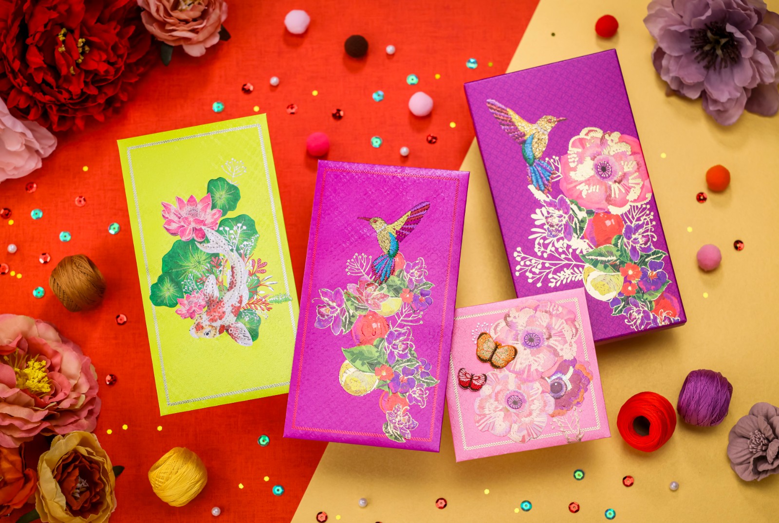 每套6個(gè)的「『繡』麗盛放」利是封,包含吉祥物福鵲、錦鯉、蝴蝶款式,分別寓意福壽雙全、富貴吉祥、幸福美滿,同時(shí)配上牡丹、碩果、荷葉等圖案及三種鮮艷奪目的開運(yùn)顏色設(shè)計(jì),當(dāng)中嬌艷桃紅色代表行好運(yùn),紫色代表招貴人,黃色則代表財(cái)源滾滾。設(shè)計(jì)雅致,手工精細(xì),立體刺繡觸感展現(xiàn)矜貴心思,燙金與閃爍珠片令利是封耀眼生輝,多重工藝細(xì)節(jié),恍如藝術(shù)品。