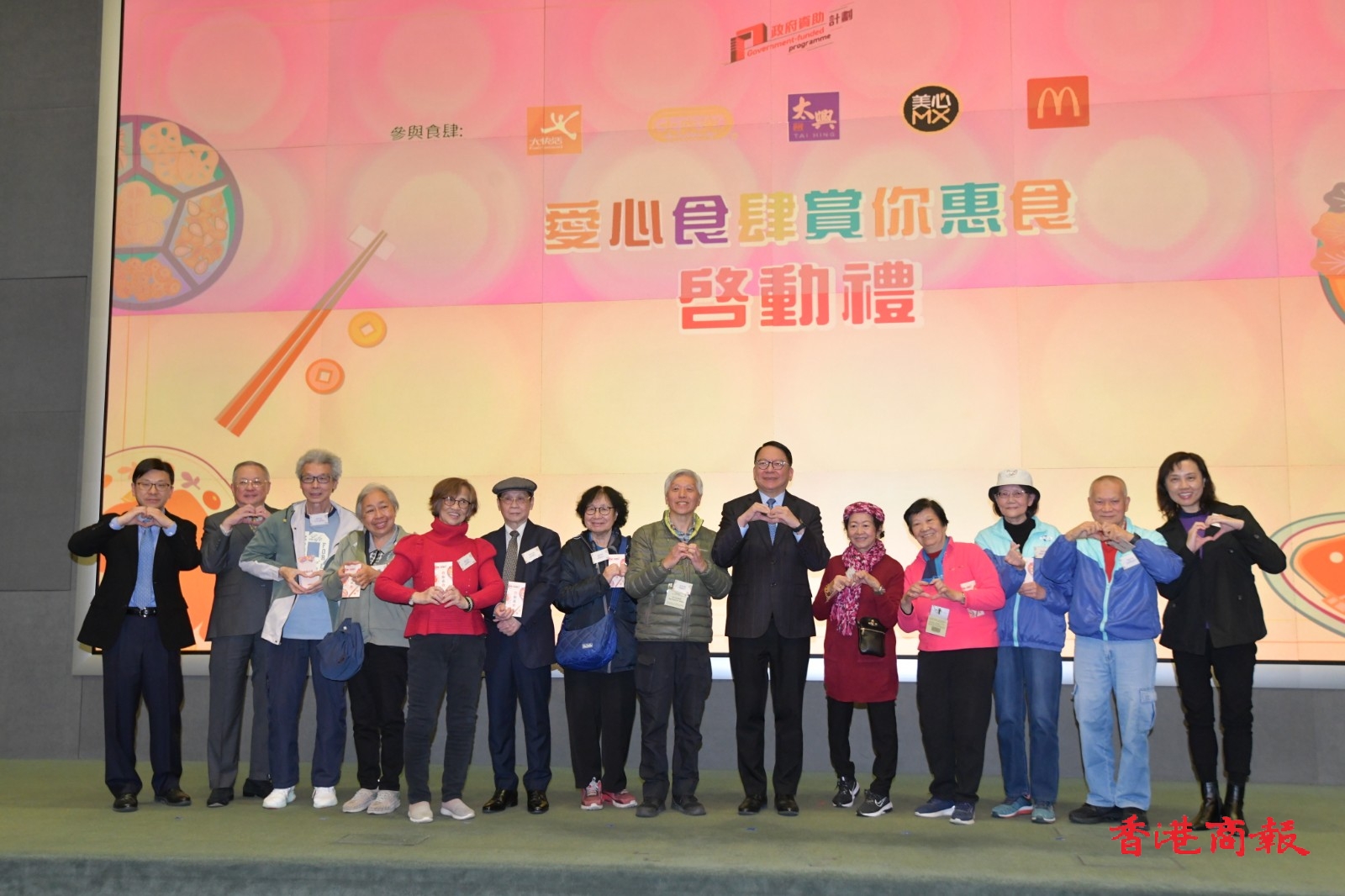 「愛(ài)心食肆 賞你惠食」計(jì)劃由政、商、民三方合作策劃,獲美心集團(tuán)、大家樂(lè)集團(tuán)、大快活、太興飲食集團(tuán)、香港麥當(dāng)勞支持,透過(guò)社署分布在全港十八區(qū)的214間津助長(zhǎng)者中心,即日起向5萬(wàn)名獨(dú)居長(zhǎng)者、雙老住戶和隱蔽長(zhǎng)者,派發(fā)每人一套5張優(yōu)惠券,內(nèi)有5間飲食集團(tuán)的優(yōu)惠劵各一張。由大年初一(1月29日)起至3月底,長(zhǎng)者可憑券到有關(guān)餐廳,以優(yōu)惠價(jià)25元享用指定招牌菜式,包括大家樂(lè)「一哥焗豬扒飯」、太興「叉燒煎蛋飯及飲品」、美心「無(wú)骨海南雞飯」、麥當(dāng)勞「魚(yú)柳包餐」等。