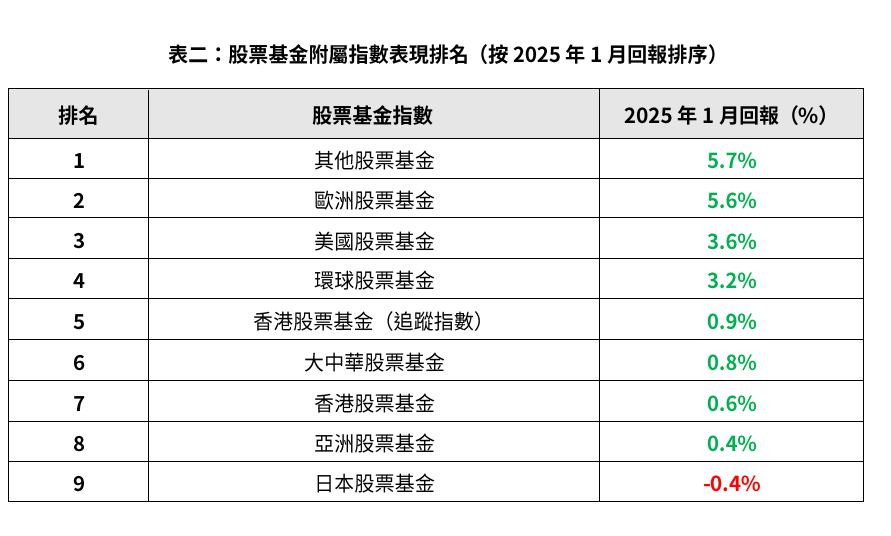 GUM指,1月份其他股票基金回報為5.7%,歐洲股票基金及美國股票基金分別升5.6%及3.6%,港股股票基金升0.6%,日本股票基金跌0.7%。