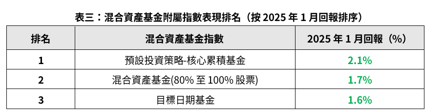 混合資產(chǎn)基金指數(shù)方面,預(yù)設(shè)投資策略—核心累積基金於月內(nèi)回報率為2.1%,混合資產(chǎn)基金(80%至100%股票)回報率為1.7%。
