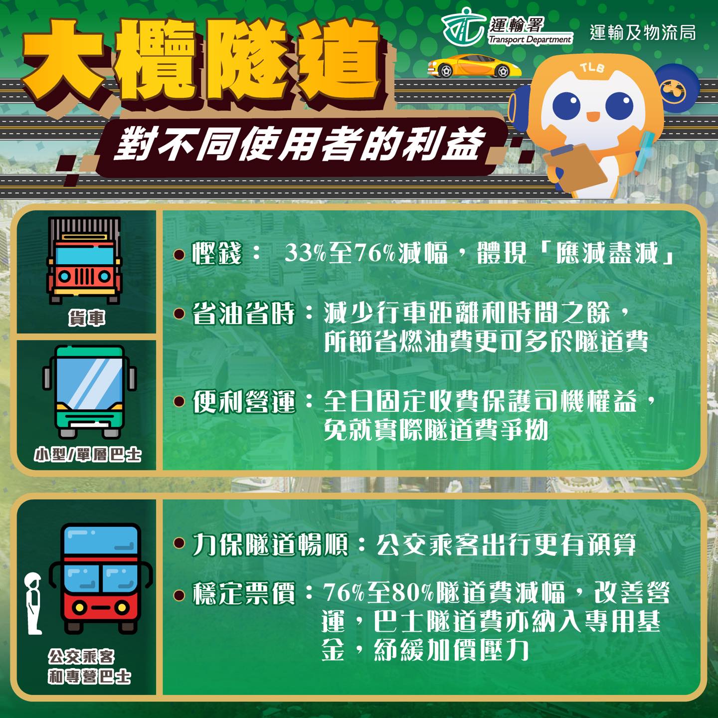 陳美寶指,隧道收費大幅下調(diào)可以令多方受惠。市民可善用大欖隧道剩餘容量 ,有助改善屯門公路的交通,出行可按需要更靈活選擇;在公交乘客方面,隧道仍能保持暢通,出行更有預(yù)算;的士則可吸引乘客選用隧道及全日劃一收費,有利業(yè)界營運;貨車及巴士可減少行車距離和時間,節(jié)省燃油費,全日劃一收費亦免爭拗;至於私家車亦可走更便捷和更舒適路線。