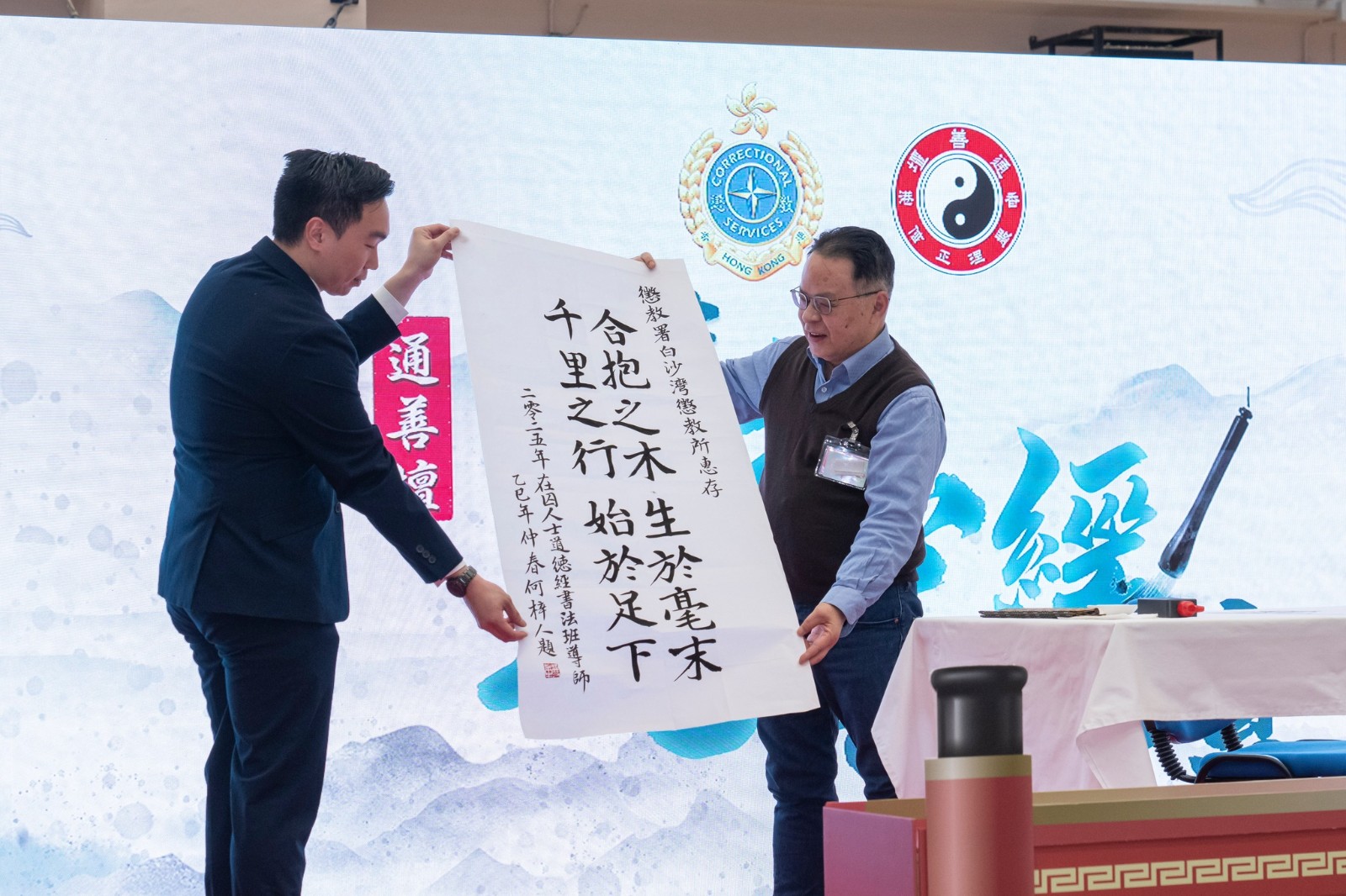 懲教署表示,白沙灣懲教所日前展開「通善壇在囚人士道德經(jīng)書法比賽」,揭幕禮由通善壇壇主葉永成、顧問李耀輝博士和理事長夏德建擔(dān)任主禮嘉賓,懲教署署理副署長(更生及管理) 唐恂連同通善壇、嗇色園、關(guān)愛共融助更生協(xié)會一眾嘉賓見證下進行揭幕。