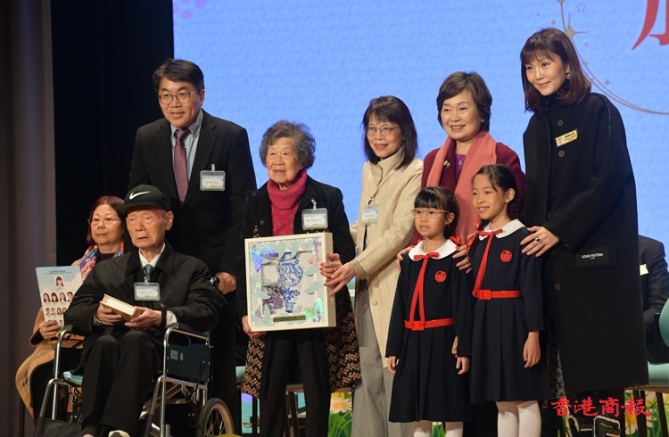 教育局局長蔡若蓮(右二)和保良局主席龐董晶怡(右一)向捐贈人致送紀念品。