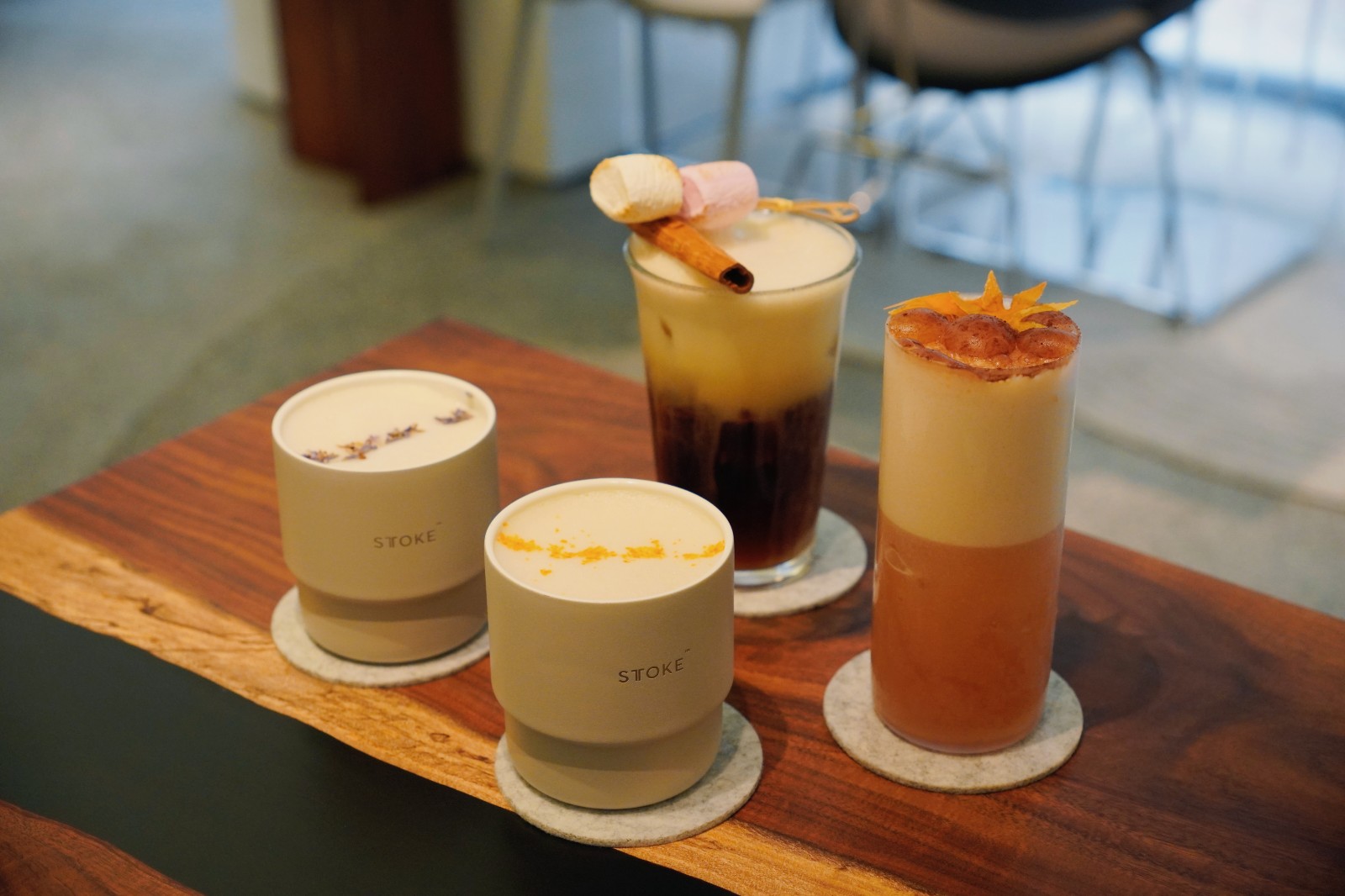 從左至右四款茶飲,「嫩芽」茶拿鐵、「展開(kāi)」茶拿鐵、「揚(yáng)眉」茶特調(diào)、「安逸」茶特調(diào)。
