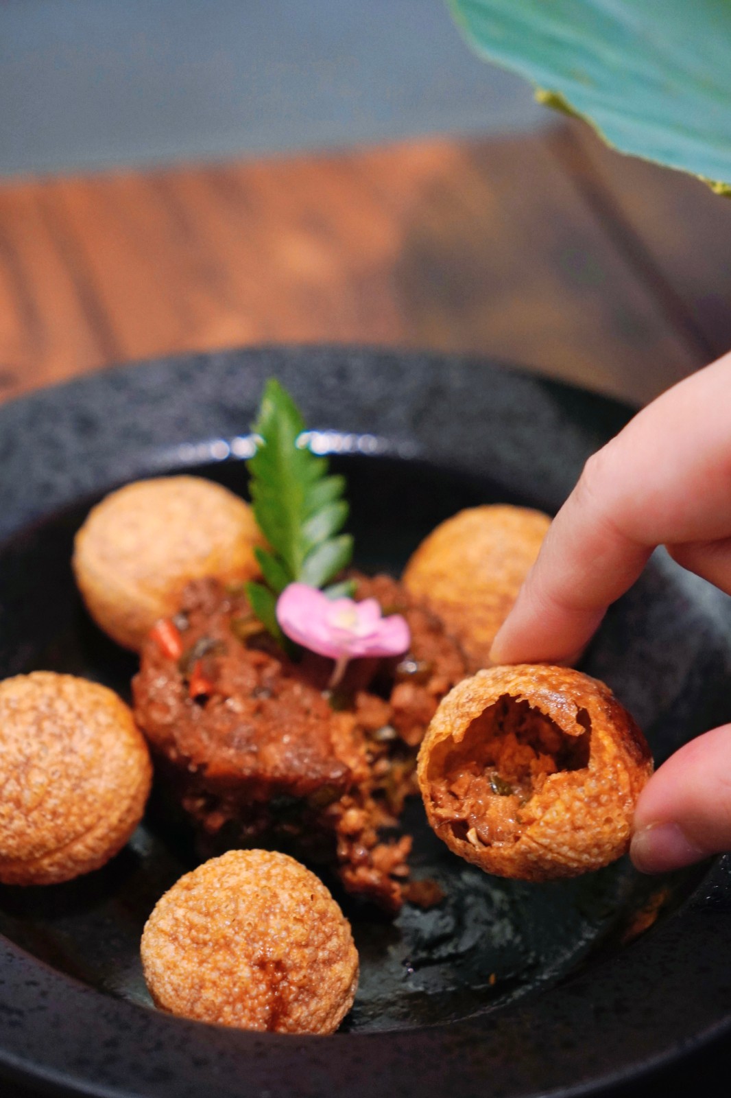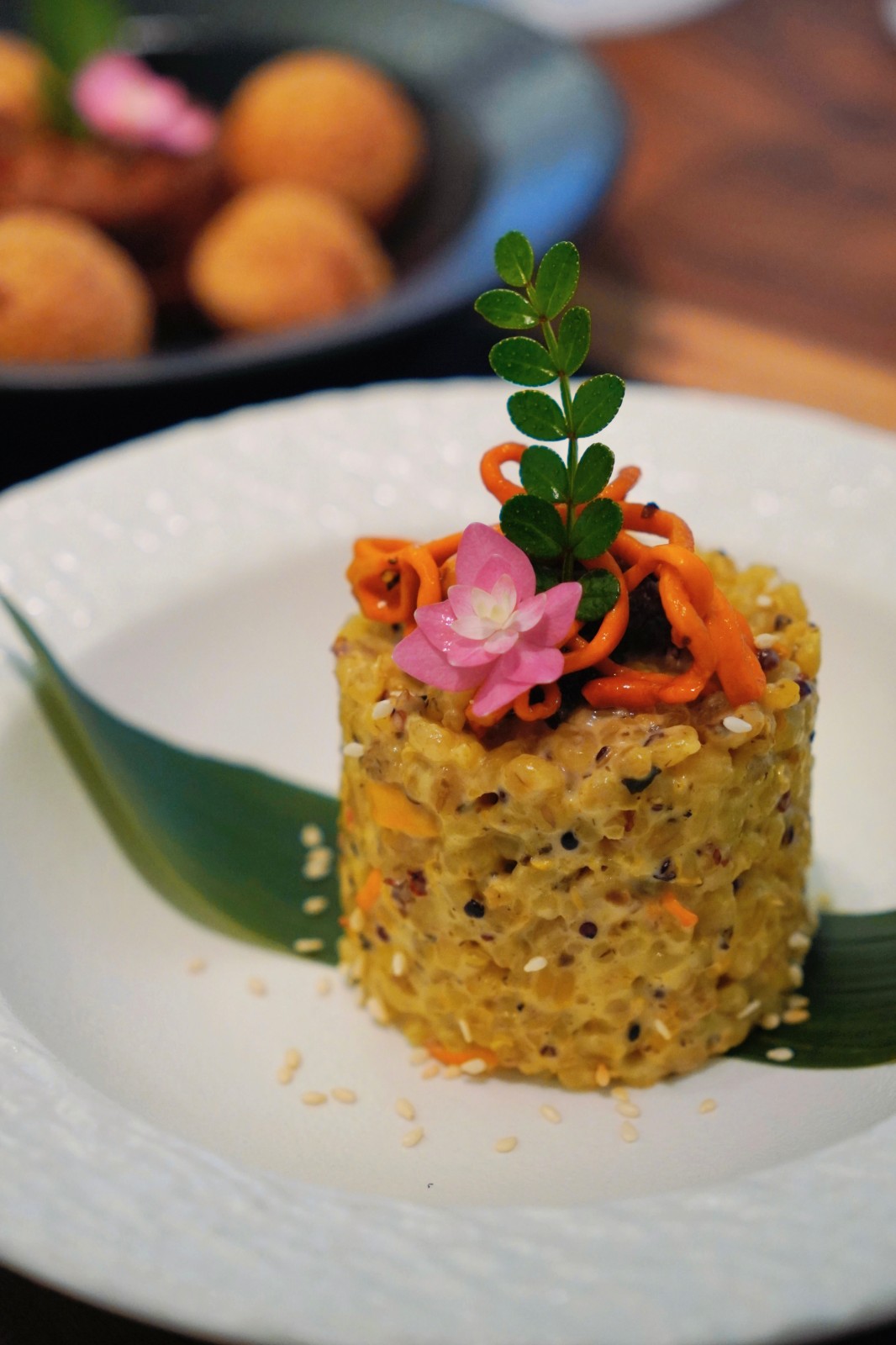 店舖環(huán)境簡(jiǎn)約舒適,晚市套餐包括前菜、小食、主食、甜品。前菜有串燒櫻桃茄拼日式照燒素帶子及黑松露油麥菜卷,前者素帶子為燒至金黃色的杏鮑菇,鮮嫩多汁;後者口感清爽,濃郁的松露和麻醬增添層次感。小食泰式素肉配印度脆球,將香辣惹味的素肉填入空心油炸球內(nèi),一口吃掉多種口感味道交織,外脆內(nèi)香。主食黑松露蟲(chóng)草花藜麥薏米飯熱量低,口感煙韌,恍如意大利飯,搭配黑松露與蟲(chóng)草花,即使首次嘗試藜麥也不會(huì)覺(jué)得難以接受。紅豆波波蓮子撻是一道中西融合的甜品,大粒又飽滿的紅豆及清香的蓮子鋪在撻上,甜度適中。