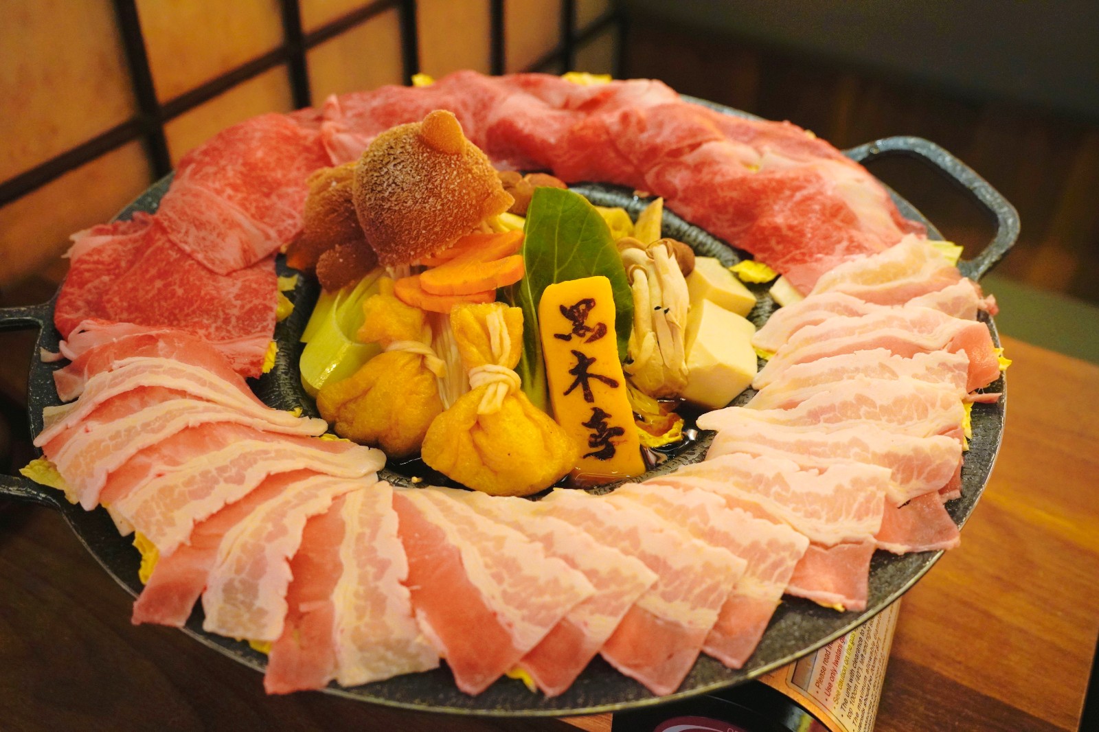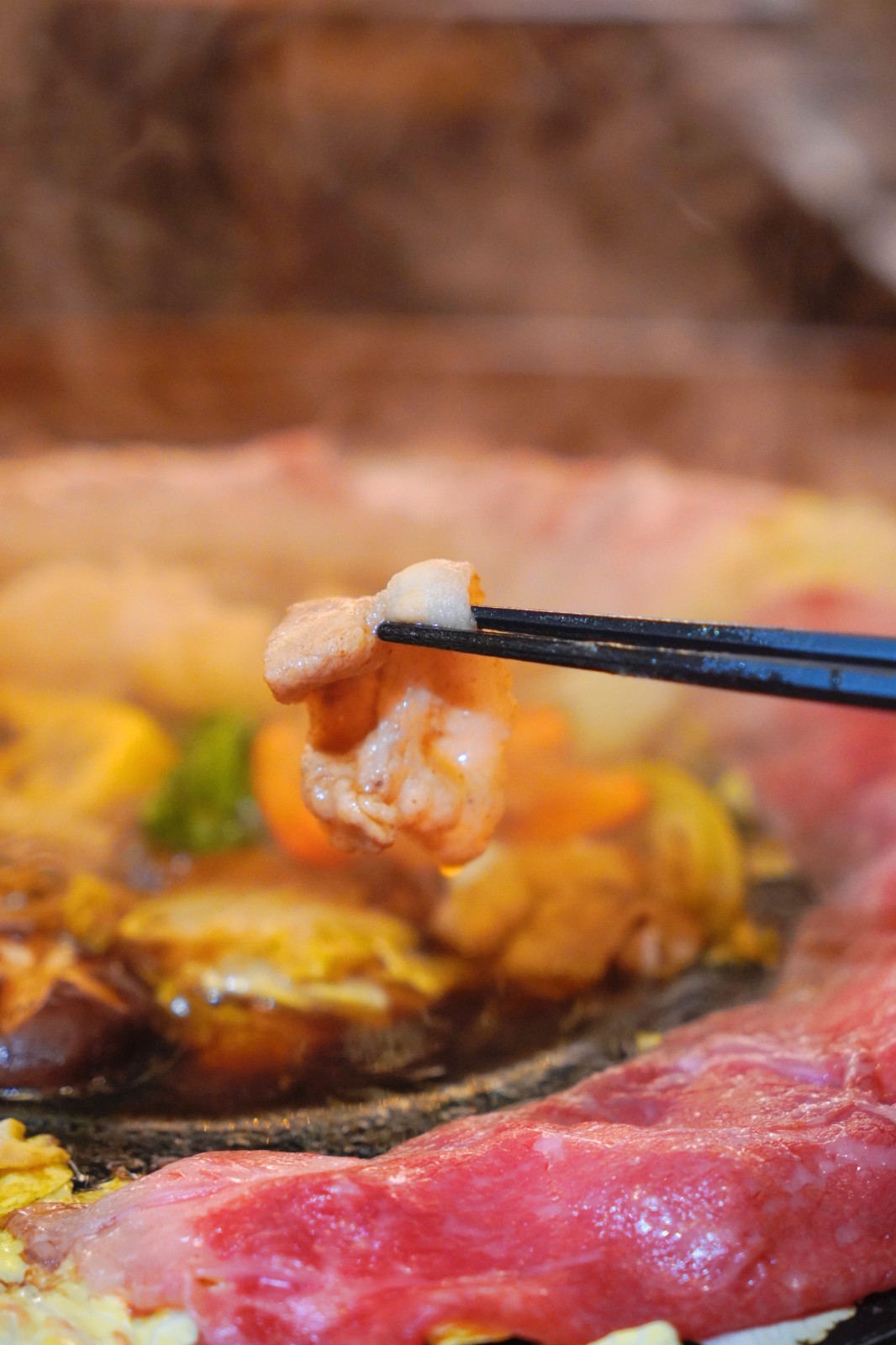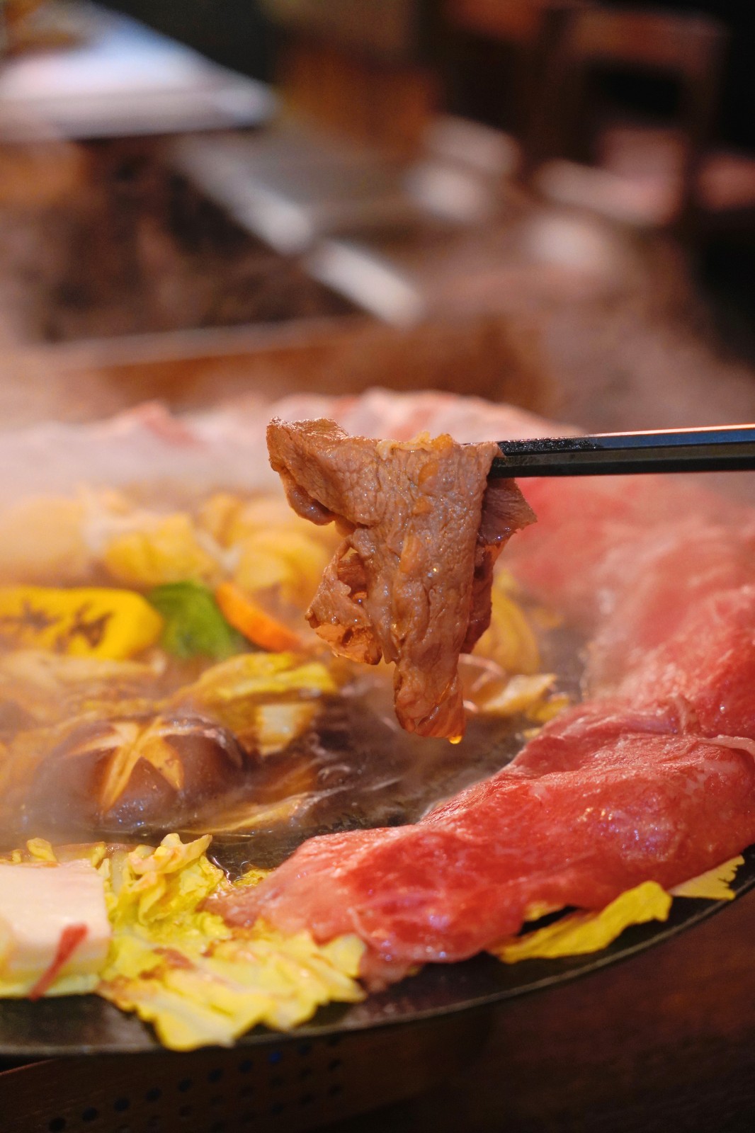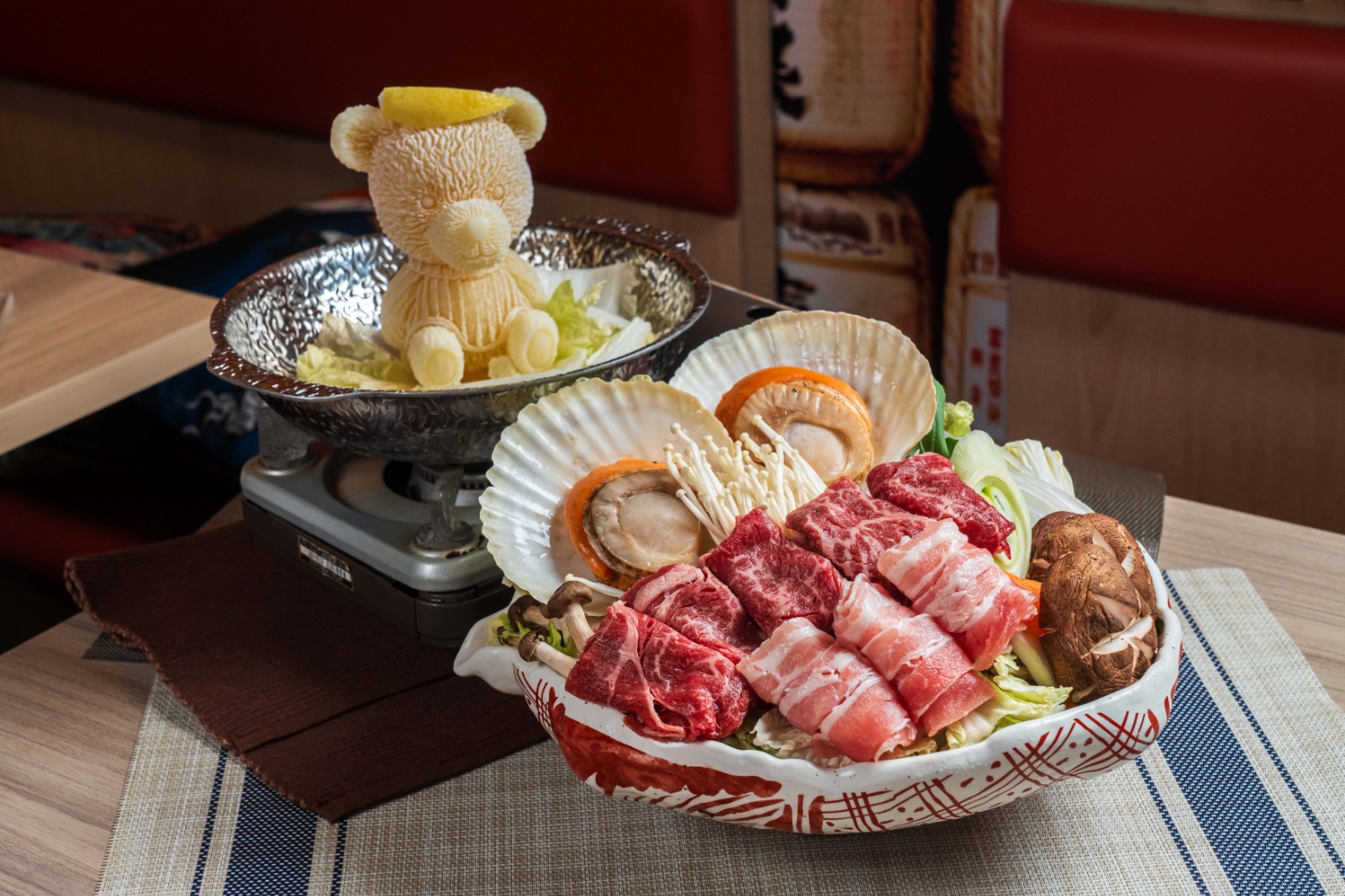 親朋聚會必然會卡,店內(nèi)不少期間限定鍋物適合拍照。包括鍋邊放滿日本松葉蟹、南非鮑魚、生蠔、大蝦等海鮮的鯛魚湯百寶海鮮鍋;以天然豆乳湯底製作成熊仔冰外形的自家豆乳豬骨鍋配M7澳洲和牛珍寶雜錦盤。「請勿打擾熊之壽喜鍋」食材可選A5宮崎和?;蛩嚯嗳馄?,又或雙拼。熊仔冰外形的壽喜燒湯底慢慢融化,鍋邊鋪滿肉類,和牛入口即溶、香甜濃郁,豚肉片肉質(zhì)軟嫩味道鮮甜,一次可品嘗種不同的肉類。