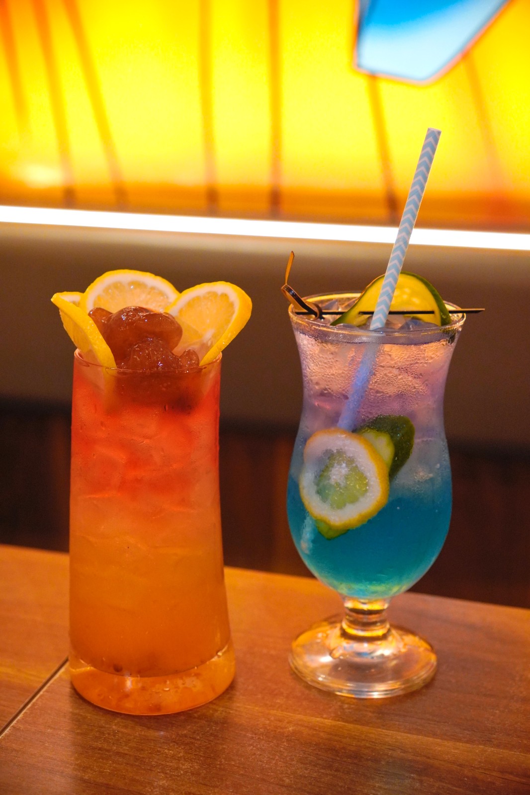 店內(nèi)多款飲品適合拍照,若不飲酒也可選擇特飲,清爽的紫幻檸檬青瓜梳打(左)及酸甜解膩的紅火龍佛手柑熊茶(右)。