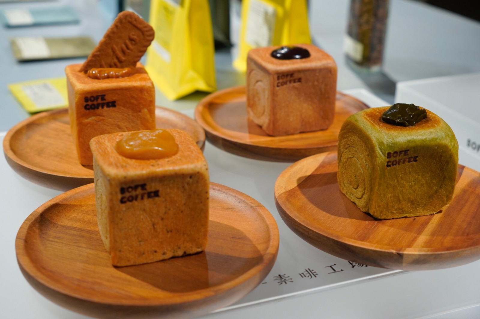 純素雙重朱古力生吐司(左前)、純素抺茶生吐司(右前)、純素咖啡生吐司(右後),HK$45。純素焦糖餅乾生吐司(左後),HK$48。