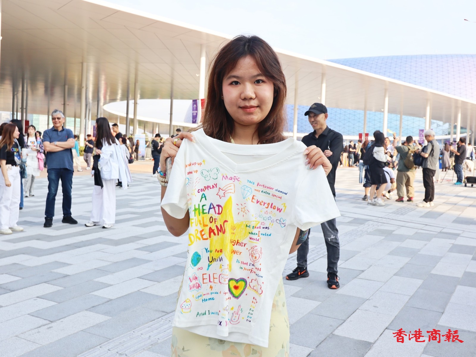 羅小姐由長(zhǎng)沙前來(lái),第一次來(lái)港看演唱會(huì)非常激動(dòng),期待聽(tīng)到《Yellow》這首歌。她在T恤全手繪,有星星,代表《A Sky Full Of Stars》歌曲,另有一些Coplay的元素如小Bass、一些歌曲歌詞,旁邊配上插圖,花了大約兩天時(shí)間繪畫(huà)。啟德場(chǎng)地做得非常好,有非常多Coldplay元素如海報(bào)、標(biāo)飾,除了看演唱會(huì)外會(huì)留港5天。