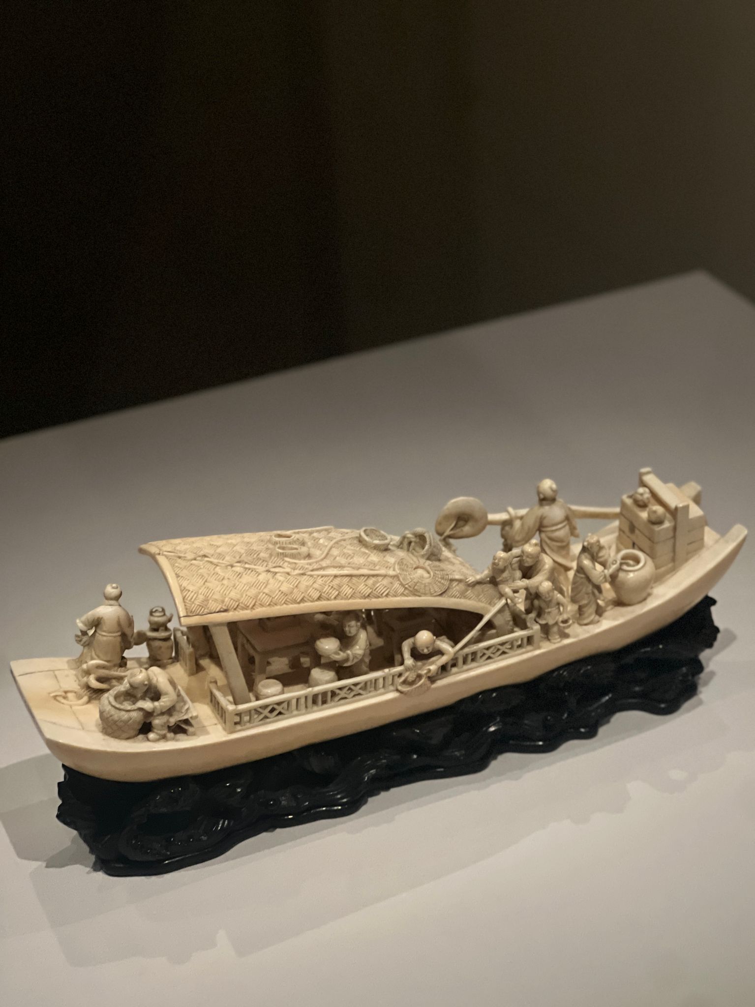 香港融匯多元的飲食文化,例如遊客會(huì)專程到避風(fēng)塘體驗(yàn)在船上享用艇仔粉。蔣得莊表示古時(shí)也有類似的旅遊概念:「明清時(shí)期交通發(fā)達(dá),江南地區(qū)水網(wǎng)密布,遊船宴飲風(fēng)氣興盛。這件由象牙製成的『船』在船尾有多層提食盒,船上有人從水中撈起河鮮、有人扇著茶爐煮茶等,反映當(dāng)時(shí)遊船的樂(lè)趣?!拐蛊冯m小,卻生動(dòng)地刻畫了水上遊憩飲食的場(chǎng)景,仔細(xì)觀察還有人正查看簍中的螃蟹,做工精細(xì)。