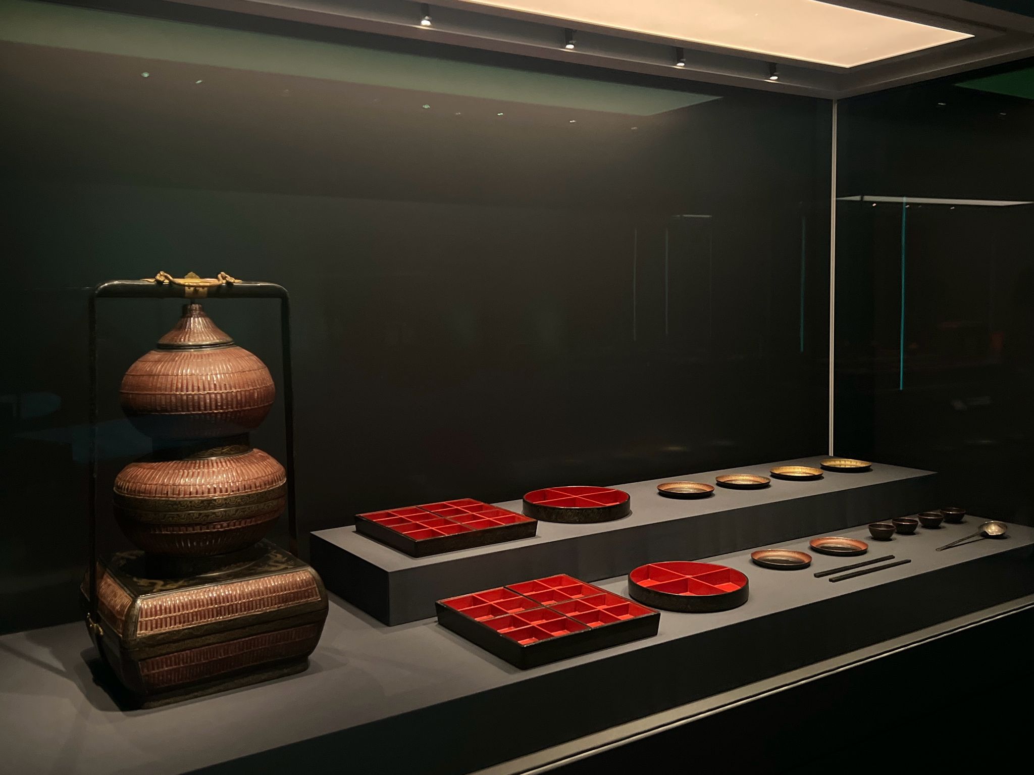 甫入展廳,映入眼簾的是一個(gè)精緻的提盒。香港故宮文化博物館研究員兼策展人蔣得莊向記者介紹,這是清代的「松鶴紋圓提盒」:「紅木製的提盒布滿螺鈿塑造的花紋,枝條、藤蔓等圖案富美感,能看出工藝之精湛?!棺辖莾?nèi),日理萬(wàn)機(jī)的皇帝並無(wú)固定的用餐地方,到用膳時(shí)間,御膳房須將餐具和飯菜送到皇帝身處之地,提盒就是承盛食物與餐具的「外賣盒」。明清時(shí)期,大眾旅遊興盛,這類提盒也常在春天郊遊野餐時(shí)用來(lái)盛裝酒菜,設(shè)計(jì)由數(shù)層屜盤組成,有時(shí)盤中帶格,方便放置不同食物,移動(dòng)時(shí)不會(huì)混作一團(tuán)。在展覽中,觀者能欣賞到多種類型提盒,如葫蘆形、方形、圓形。策展團(tuán)隊(duì)也受此啟發(fā),以「移動(dòng)」作為展覽主題,並分為「跨越生死」、「跨越文化」、「跨越山水」展區(qū),以探討飲食器具在精神、文化與空間上的移動(dòng)性。如「跨越生死」展示了陪葬物品「生器」,這些墓葬出土的飲食器物反映了當(dāng)時(shí)人對(duì)飲食文化的重視。展覽呈現(xiàn)的西漢中晚期穀倉(cāng)、水井、豬舍、屋倉(cāng)、磨等鉛釉陶明器,代表陵墓主人對(duì)死後依然能夠富足生活的祈求。另一展品、漢代的陪葬品「烤蟬爐」,以低溫鉛釉燒製,爐上放置兩排蟬,反映當(dāng)時(shí)民間有吃蟬的習(xí)俗。