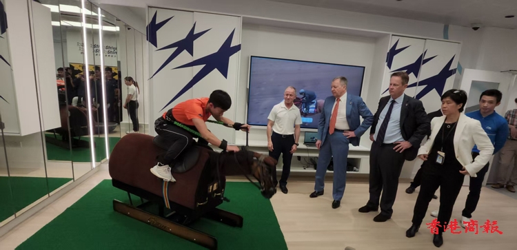 應(yīng)家柏及後在夏定安、馬會見習(xí)騎師學(xué)校首席騎術(shù)教練高雅志陪同下參觀裝修好的馬房,他們又走進課室,觀看見習(xí)學(xué)員踏上馬匹訓(xùn)練工具示範(fàn)。應(yīng)家柏鼓勵見習(xí)學(xué)員,努力向夢想進發(fā)。