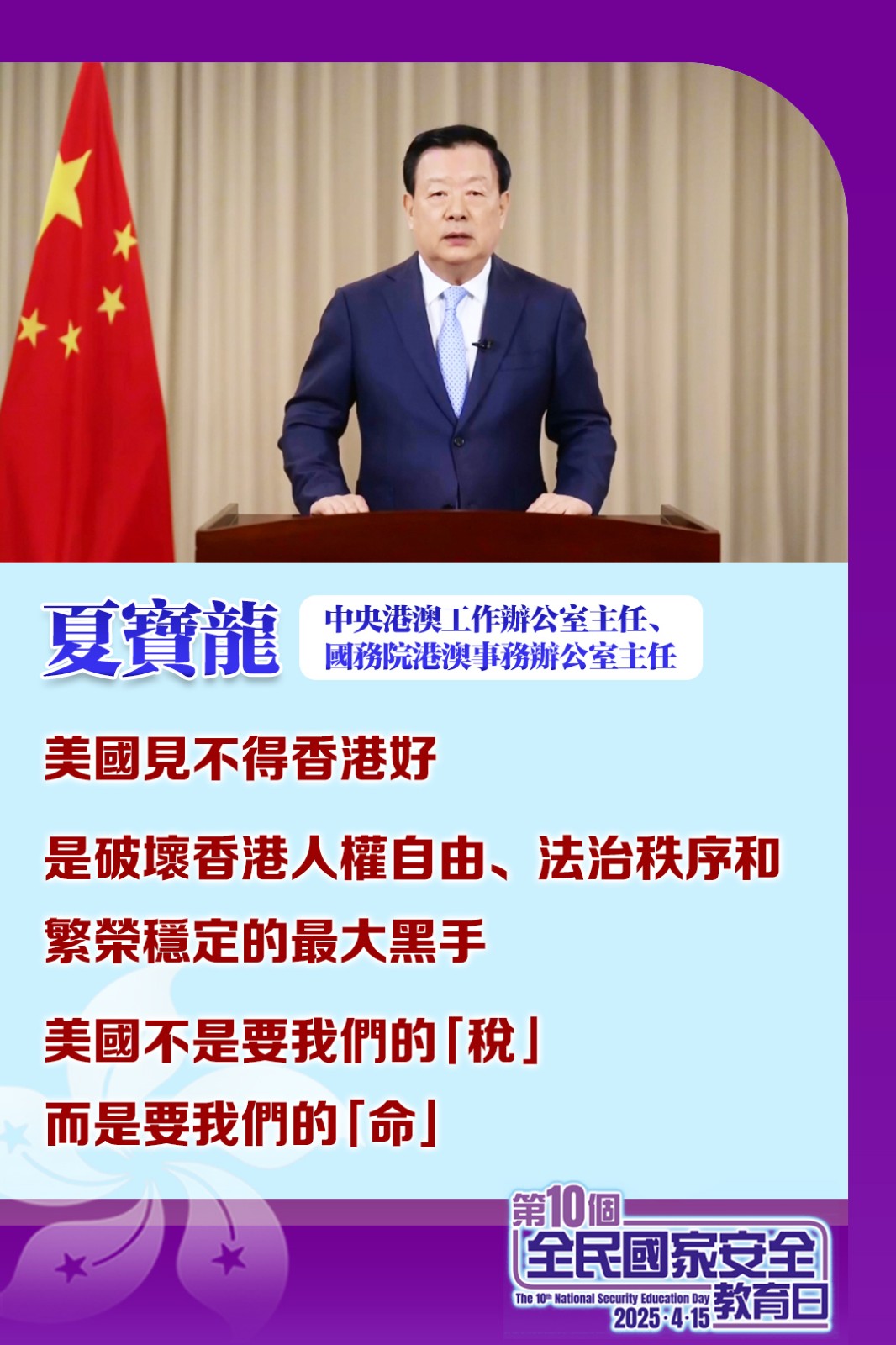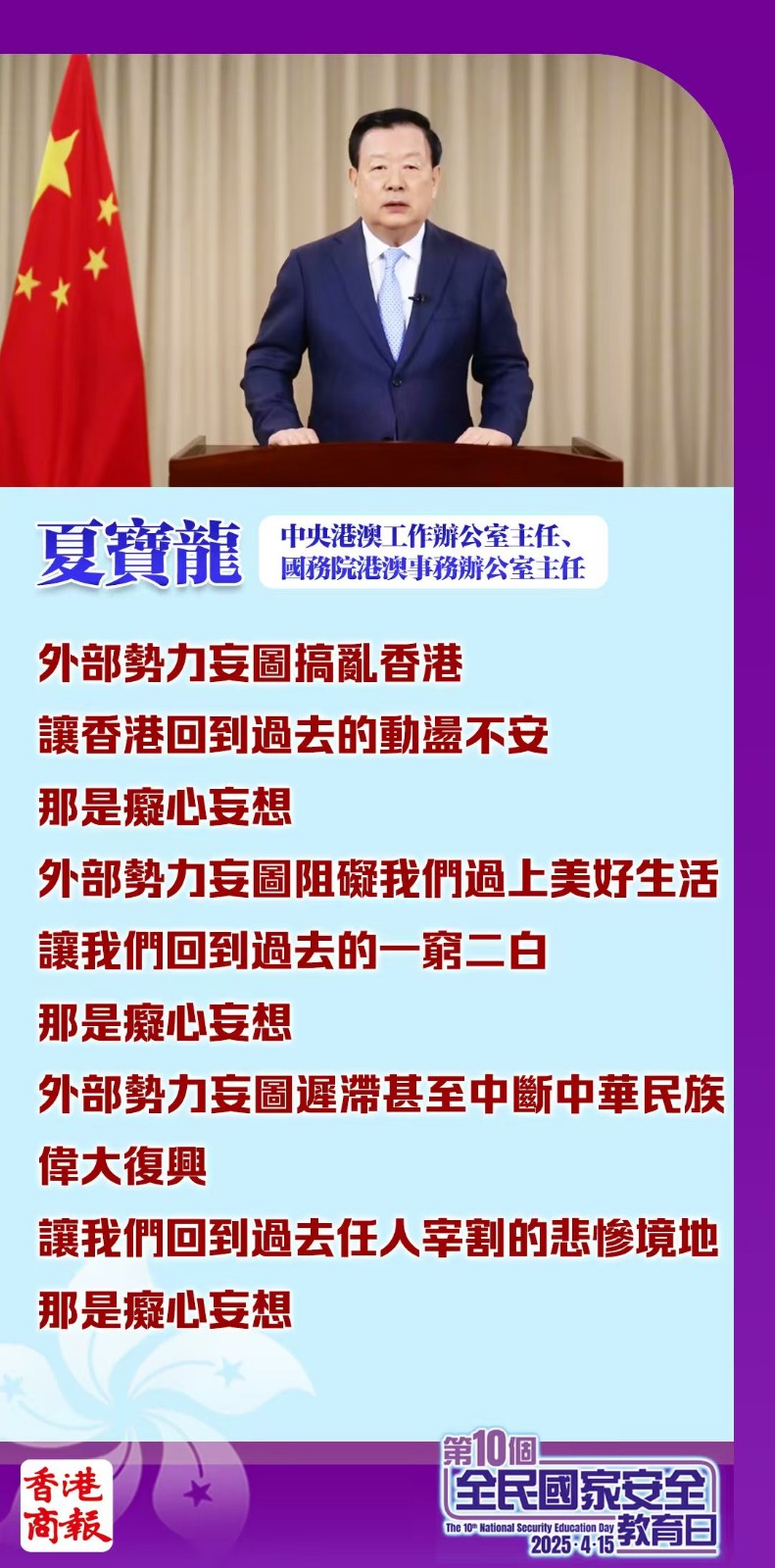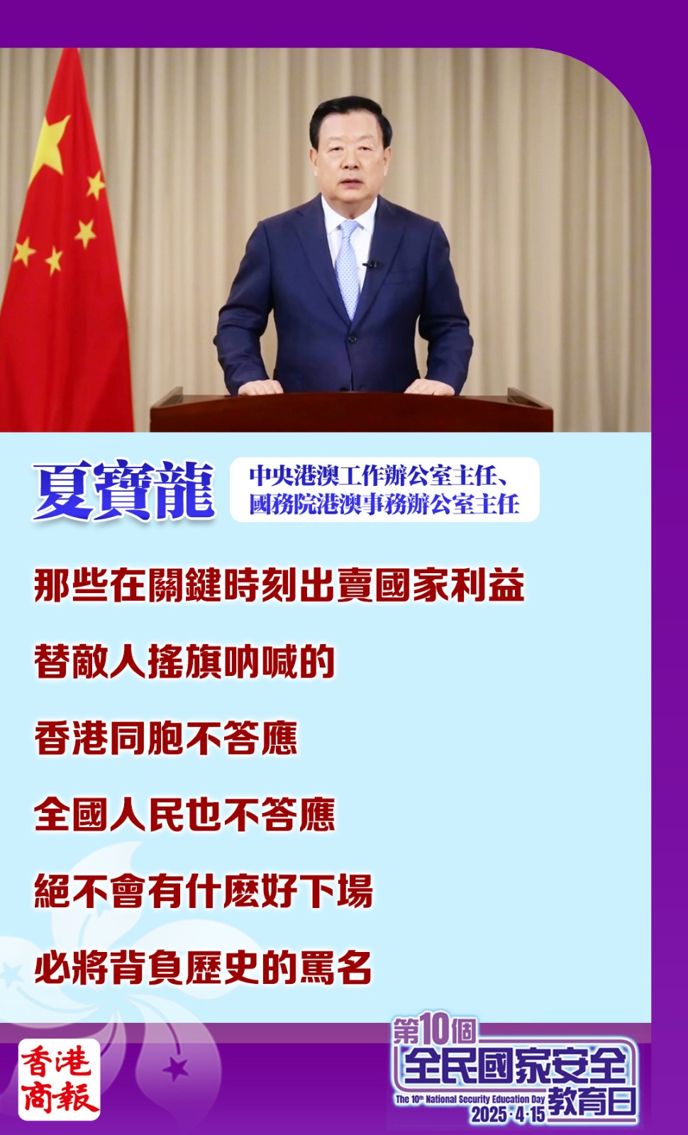 全民國(guó)家安全教育日開(kāi)幕典禮暨主題講座今日(15日)在會(huì)展中心舉行,中央港澳工作辦公室主任、國(guó)務(wù)院港澳事務(wù)辦公室主任夏寶龍以視頻方式出席開(kāi)幕禮,並發(fā)表主旨講話。以下為夏寶龍主任講話金句: