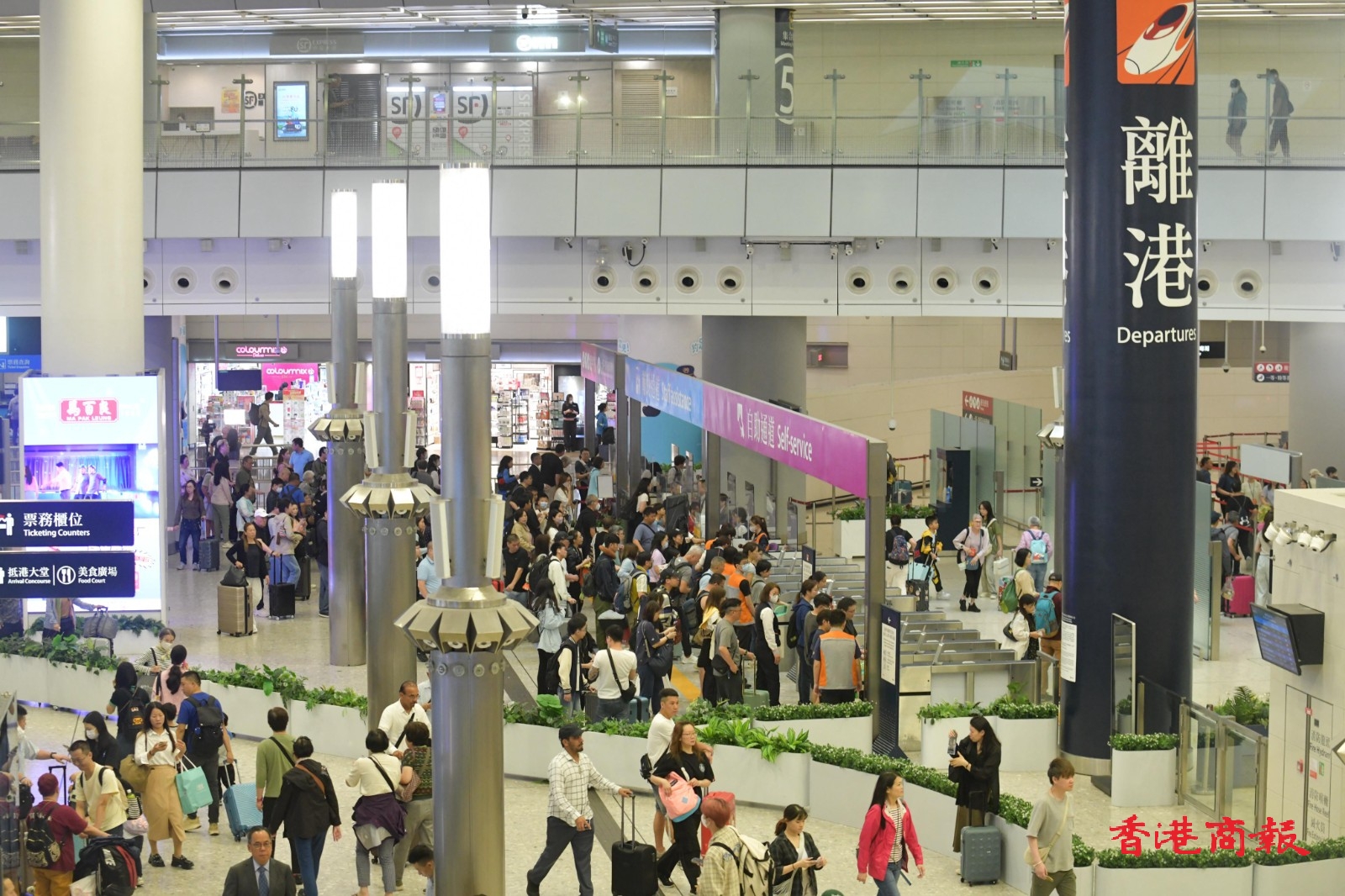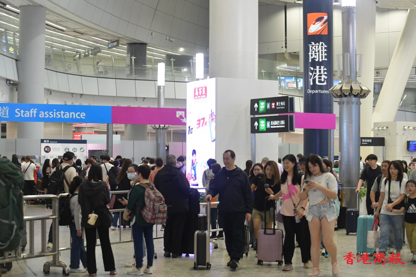 今日是復(fù)活節(jié)假期首日,香港國際機(jī)場、高鐵西九龍站等都見等候出入境的人潮。早上及中午,高鐵西九龍站人山人海,大批市民推著行李,期待假期旅程。車站顯示屏顯示,多班列車車票售罄?,F(xiàn)場亦有職員做好協(xié)調(diào),現(xiàn)場秩序大致良好。