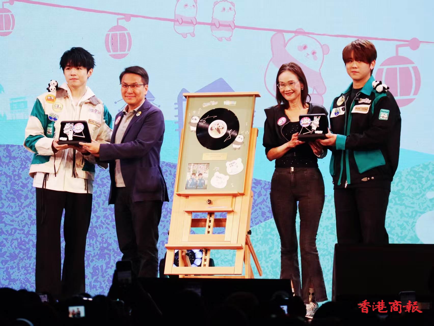陳卓賢(最左)和姜濤(最右)獲贈(zèng)送紀(jì)念品致意,兩人亦禮尚往來,送出自己親筆簽名的黑膠唱片給園方。