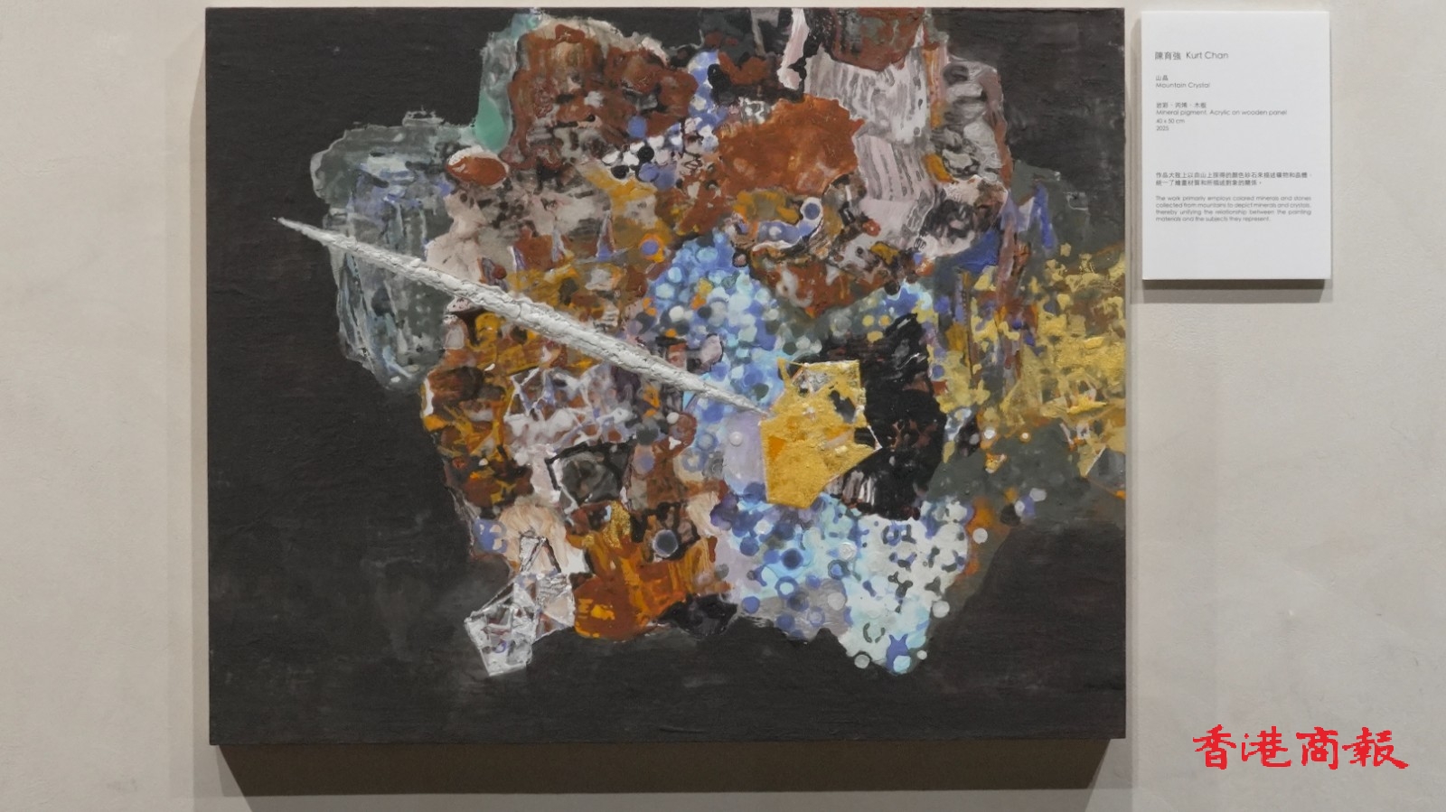 走進(jìn)幾乎都是畫作的展覽現(xiàn)場,往左看,落地窗邊擺著兩塊巨大的巖石狀的裝置作品。它們的創(chuàng)作者是香港巖彩藝術(shù)學(xué)會副會長朱秋慧。紙、石膏和巖彩都是來源於自然的材料,作品展現(xiàn)了天然色彩的細(xì)膩和純粹,如同藝術(shù)家認(rèn)為作品是喜悅的感受本身;朱秋慧認(rèn)為運用巖彩是一個冥想的過程,顏色隨著不斷的疊加產(chǎn)生變化,常常帶來不可預(yù)期的效果。她提到,自己和鍾大富一起在香港巖彩藝術(shù)學(xué)會推廣巖彩,給予藝術(shù)家更多的媒介選擇。