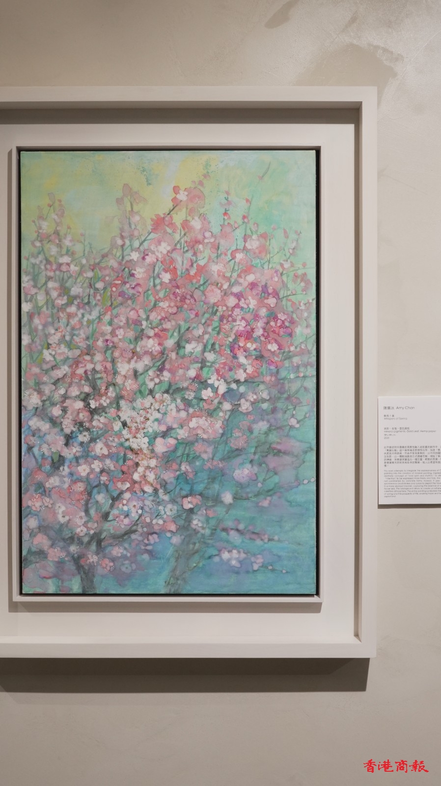 對花的描繪,還有畫家陳慧彬,她以流動的筆觸,展現(xiàn)出春日花朵盛開的景象。她在巖彩作品中融入了中國畫追求的氣韻生動,她先以隨性的筆勢鋪陳,再層層疊化色彩。巖彩的特性使畫面在疊色之間自然透出底色。她希望作品不只是裝飾性的呈現(xiàn),而是在虛實之間,留下精神性的想像空間。