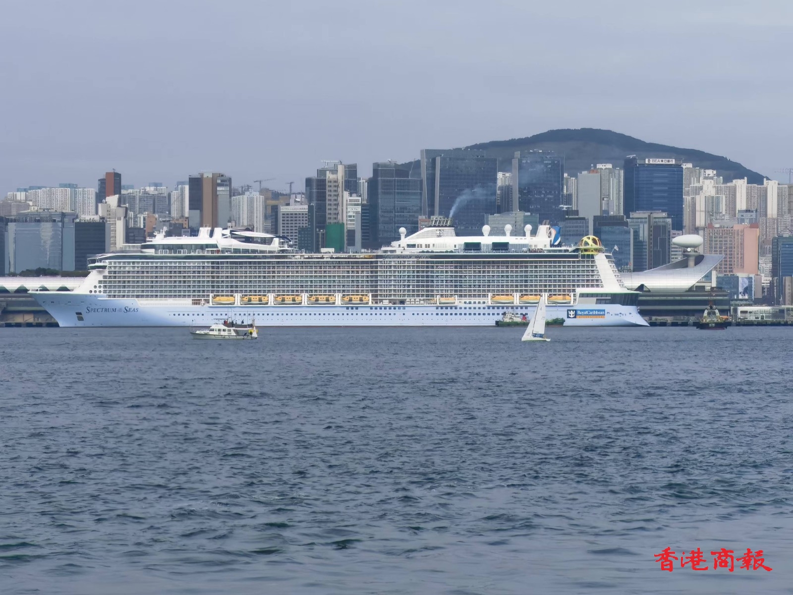 在波濤蕩漾的維港海面經(jīng)常有帆船在訓(xùn)練,巨大的郵輪停泊在啟德郵輪母港。觀塘小輪經(jīng)過(guò)近前,可以近距離觀看各式帆船和這艘海上巨無(wú)霸。