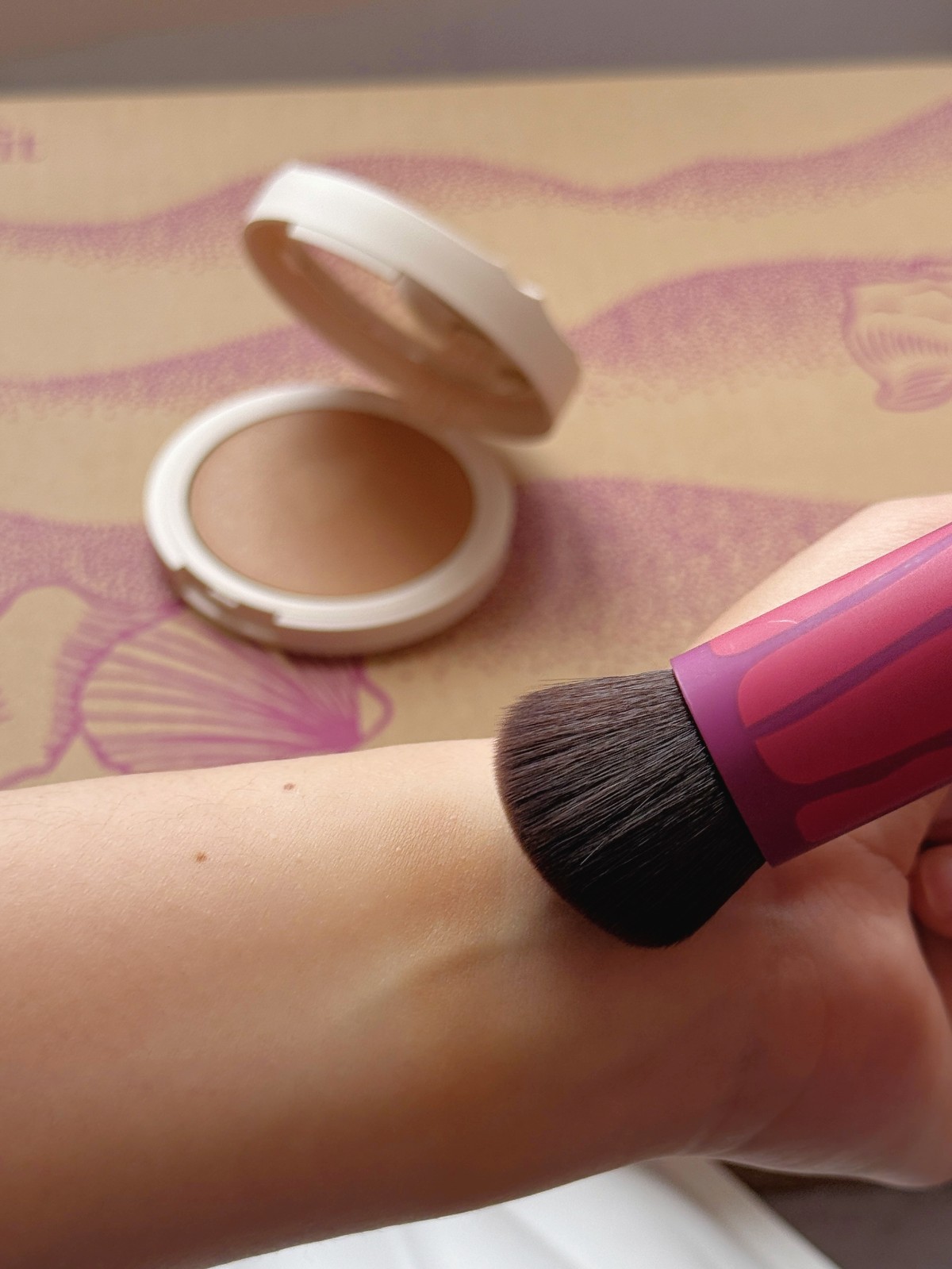 Hoola古銅胭脂蜜粉亦推出全新色調(diào)Medium,持久溫暖古銅色澤滿足不同喜好和膚色需求。蜜粉不致粉刺配方中蘊含熱情果籽油,讓肌膚更顯絲滑,膚色均勻。細(xì)緻幼滑的粉質(zhì)容易推開,貼合肌膚紋理,並同樣具有防水、防汗功能,全日使用也質(zhì)感舒適。使用時建議以化妝掃沾取適量胭脂蜜粉掃於面頰蘋果肌位置,沿顴骨往上向外暈染。再利用掃上餘粉,於鼻樑兩則掃開,營造日曬效果?;蚩烧慈∩倭抗陪~粉,掃在下顎線及於額頭連接髮際線邊緣輕掃開,營造深邃輪廓效果,也可用於外露的部位,如肩膀或胸口,為肌膚添上古銅色調(diào),全身散發(fā)健康光澤。