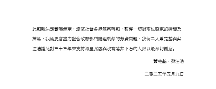 「我倆一直以來都全心全意歇盡所能,用盡一切方法嘗試挽救公司及公司業(yè)務(wù),很可惜因為經(jīng)營環(huán)境極其嚴峻,而無奈結(jié)束業(yè)務(wù)?!孤暶髦赋?,他們已主動聯(lián)絡(luò)勞工處並提供所需文件及一切細節(jié)。而勞工處亦會加快地按程序處理後續(xù)事宜,他們更會盡力配合政府部門處理剩餘的勞資問題。望社會各界體察。