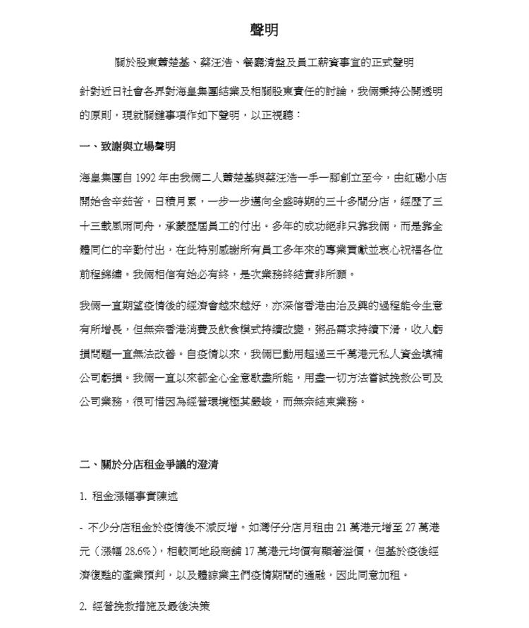 聲明表示,自疫情以來,已動用超過三千萬港元私人資金填補公司虧損,連唯一的居住物業(yè)都已被賤賣,無力再繼續(xù)透過貸款等方法去填補虧。